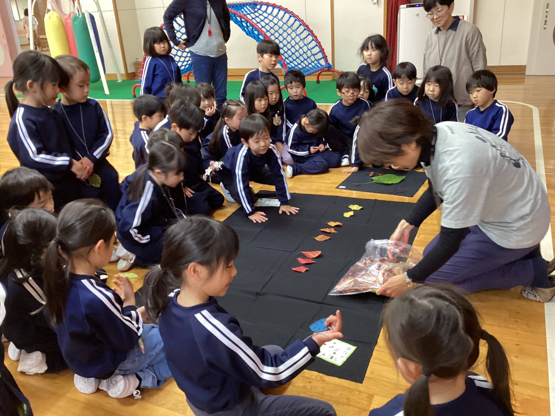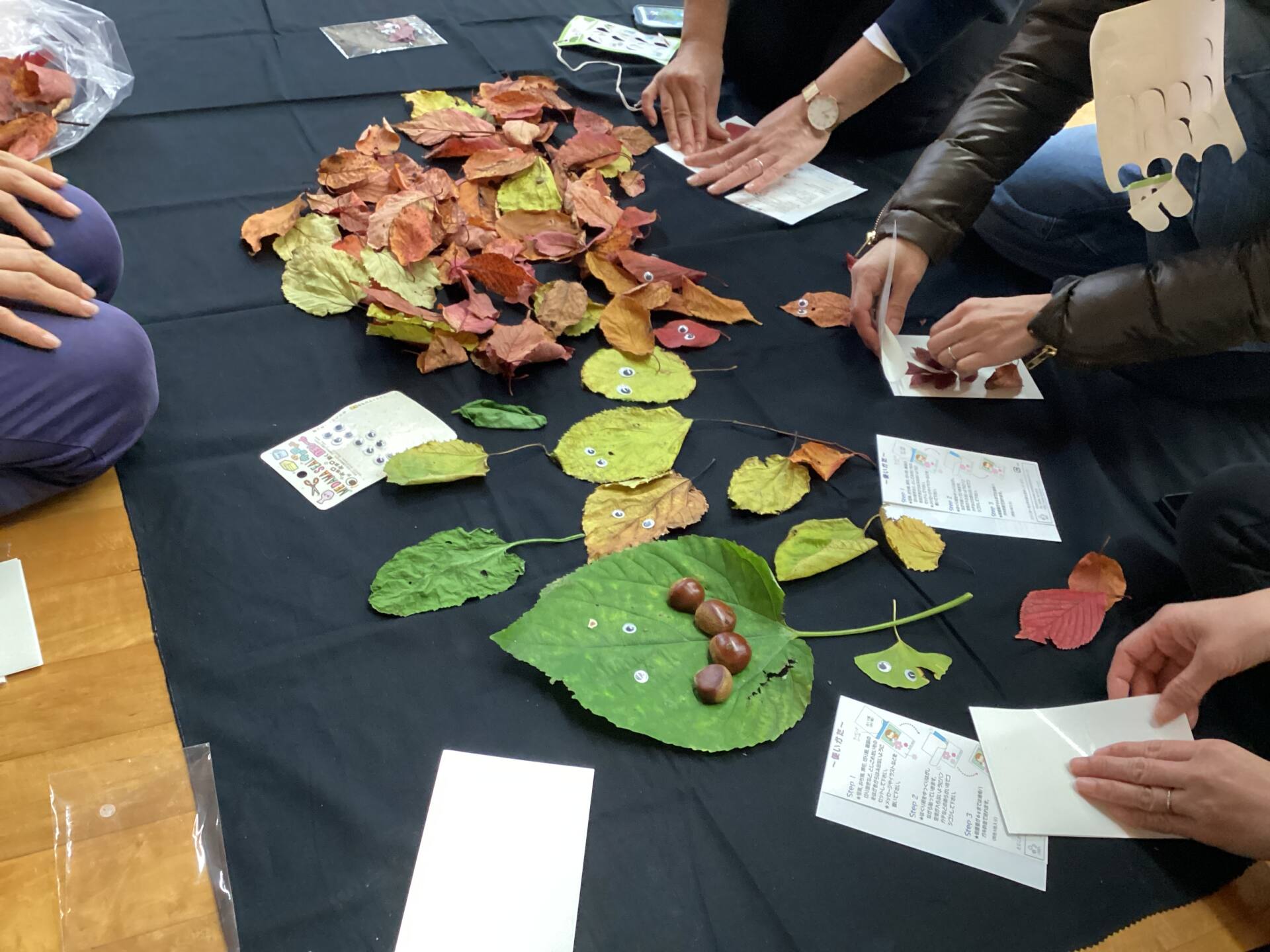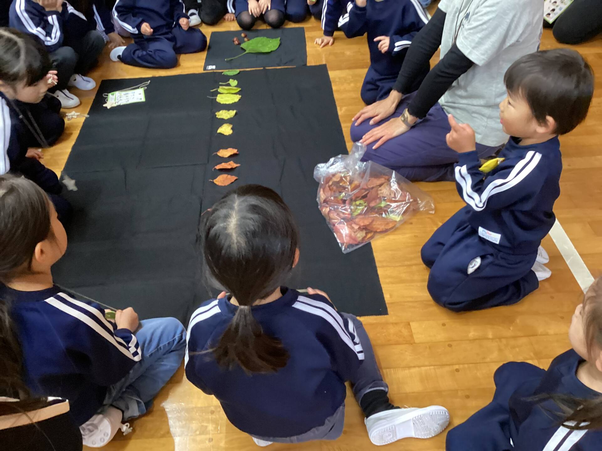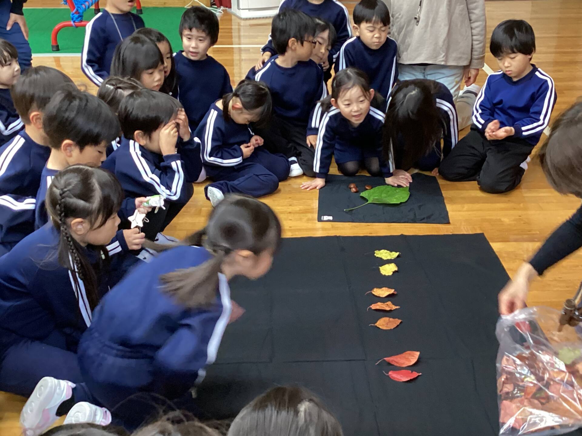 玉川大学から仁藤先生がいらっしゃって森の幼稚園が行われました🍁五感を感じるプロジェクトの一環で、白百合学園の敷地内にお散歩に行きました。途中から雨が降ってきましたが、大きな葉っぱや🌿🍁🌰栗などを見つけました。園に帰ってきてからは落ち葉を並べグラデーションの綺麗さに驚きました‼️