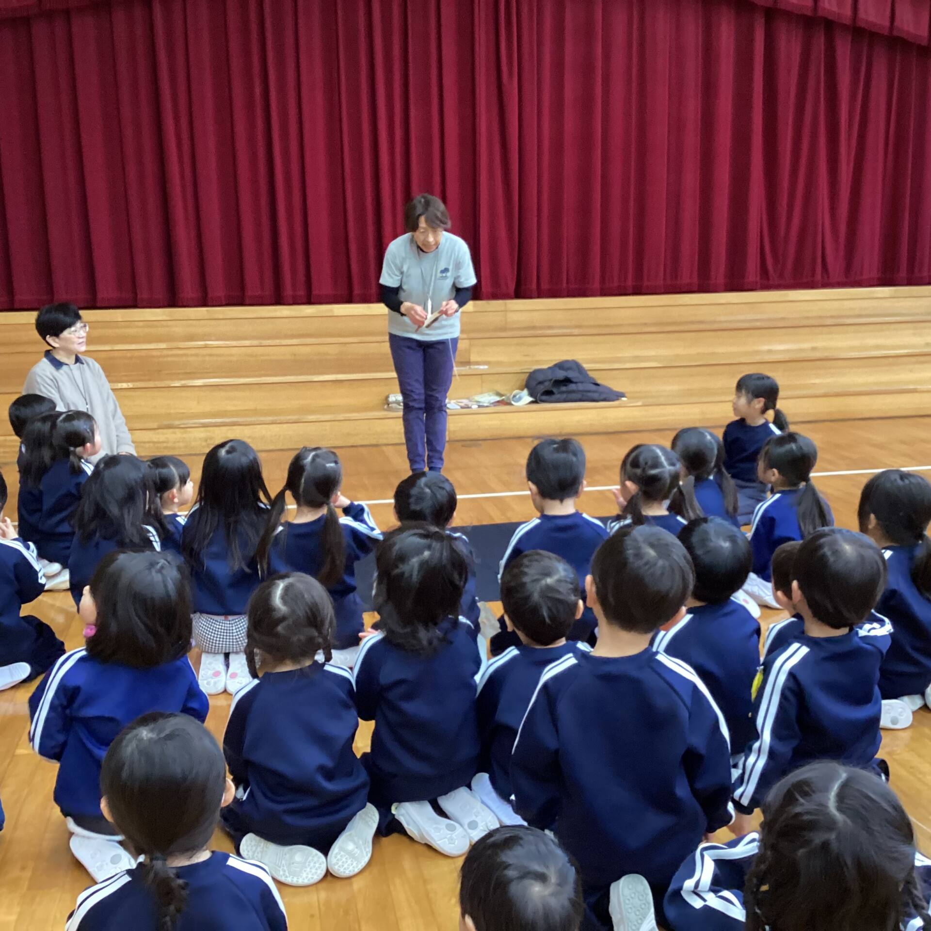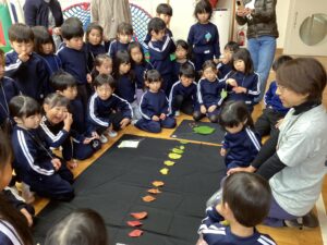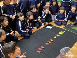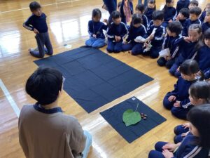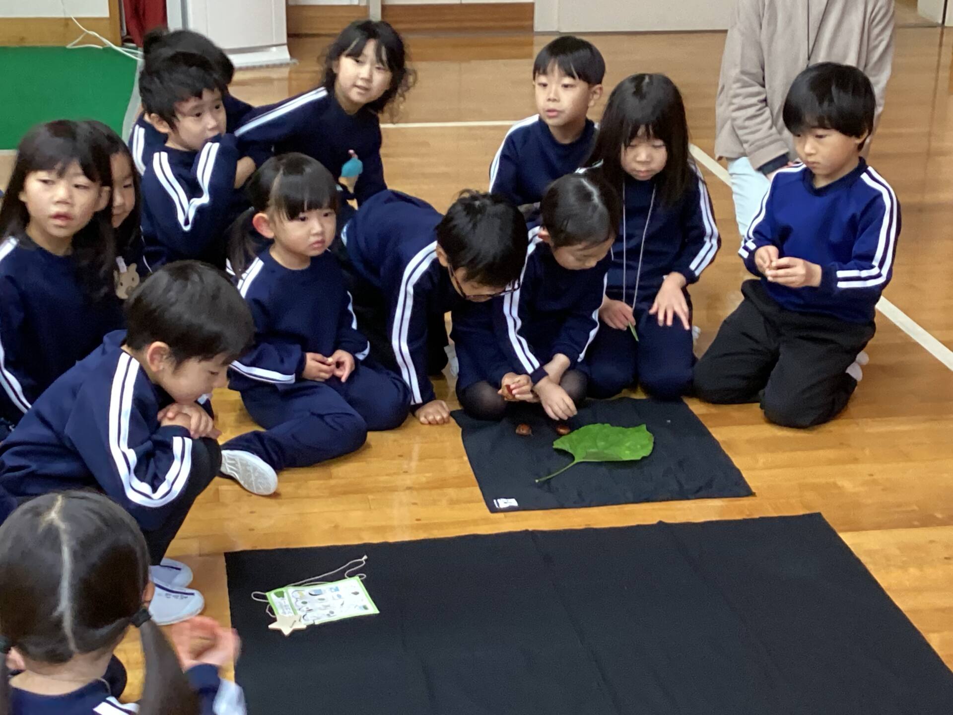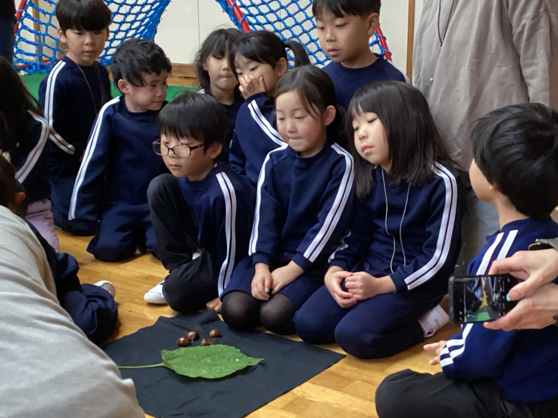 玉川大学から仁藤先生がいらっしゃって森の幼稚園が行われました🍁五感を感じるプロジェクトの一環で、白百合学園の敷地内にお散歩に行きました。途中から雨が降ってきましたが、大きな葉っぱや🌿🍁🌰栗などを見つけました。園に帰ってきてからは落ち葉を並べグラデーションの綺麗さに驚きました‼️