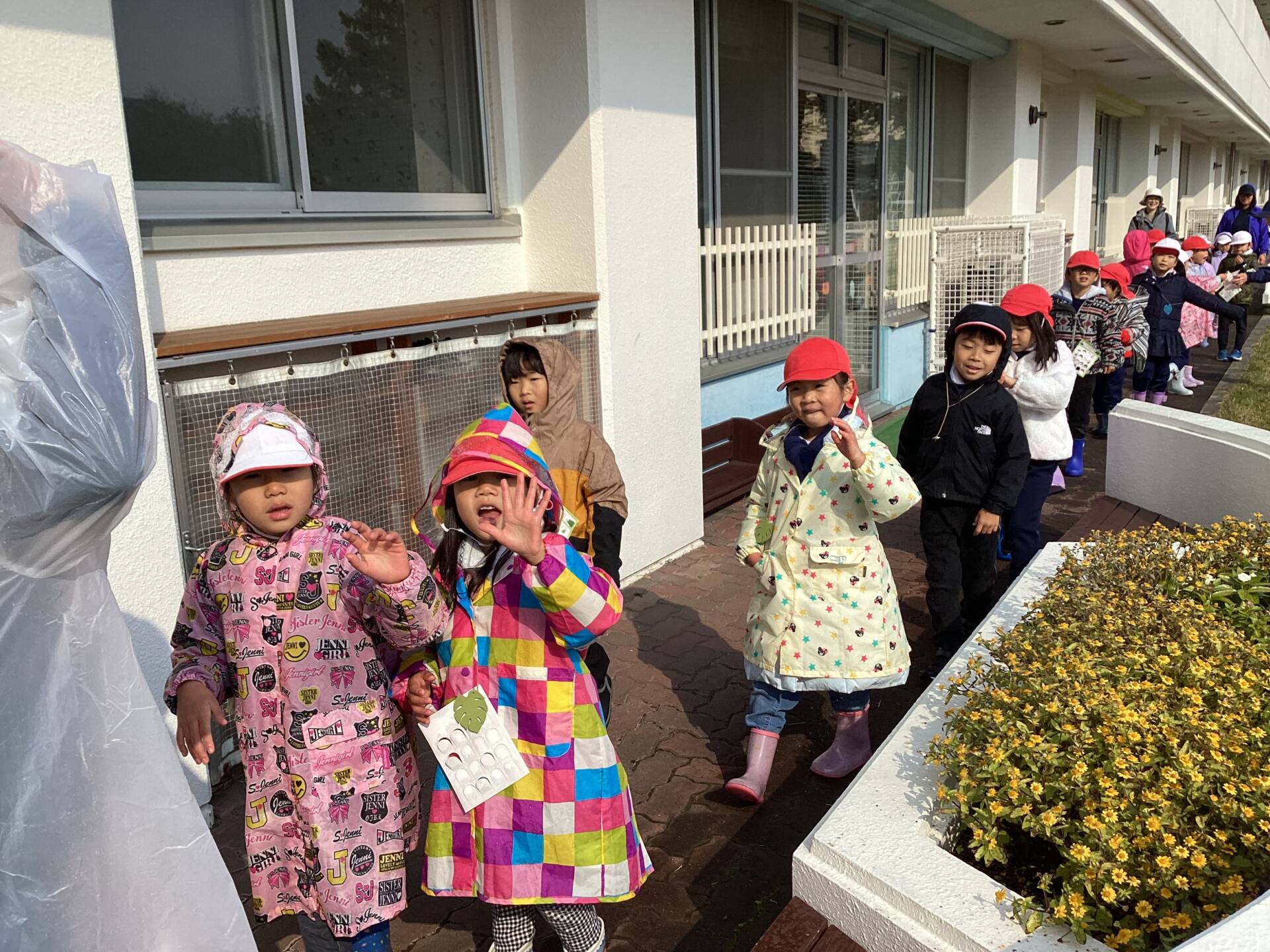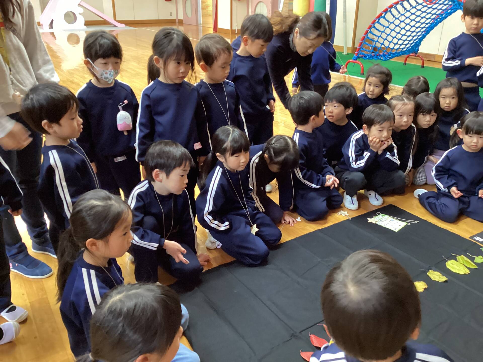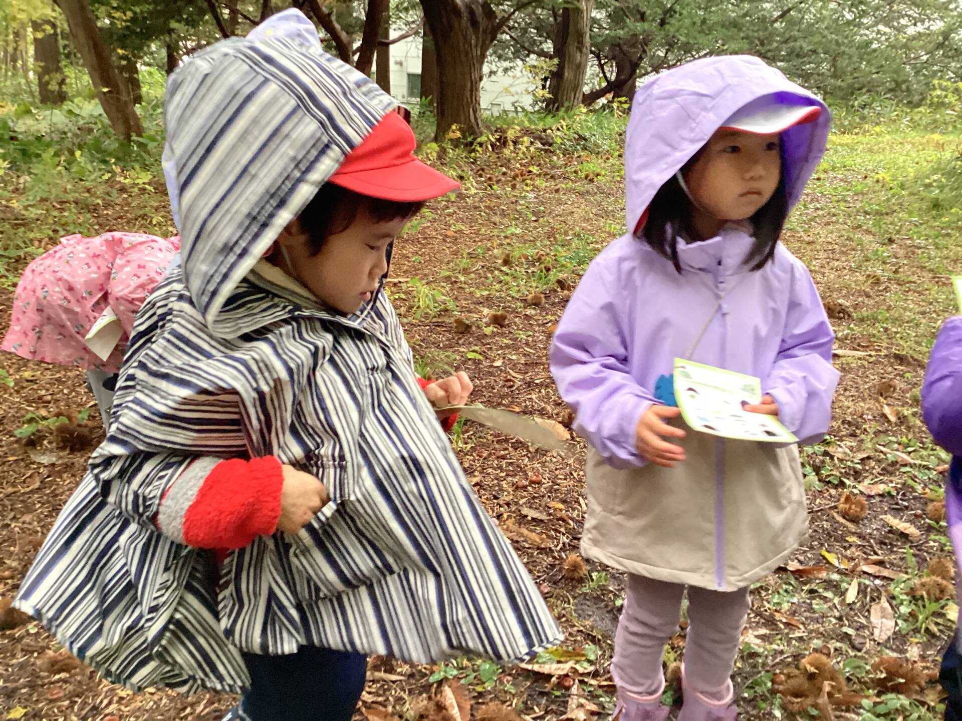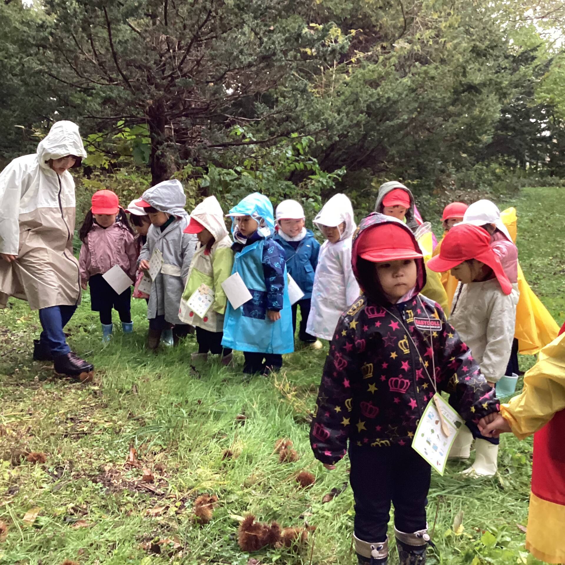 今日は年少.満3.年長児の森のようちえんが行われました。玉川大学から仁藤先生がいらっしゃって白百合の森に散策です♪朝は強い雨が降っていましたが、出発するときは青空が見えました。森に🌳到着すると雨が降ってきましたが、雨が降る中でのお散歩はとても良い経験となりました☆🌰綺麗に色が変わった葉🍃🍂🍃🍂風、雨の匂いなど様々な事を感じました。雨が強くなってきたので早めに切り上げましたが、🍁落ち葉を並べただけなのに綺麗なグラデーションができました。自然物を使って遊ぶ楽しさを知りました!