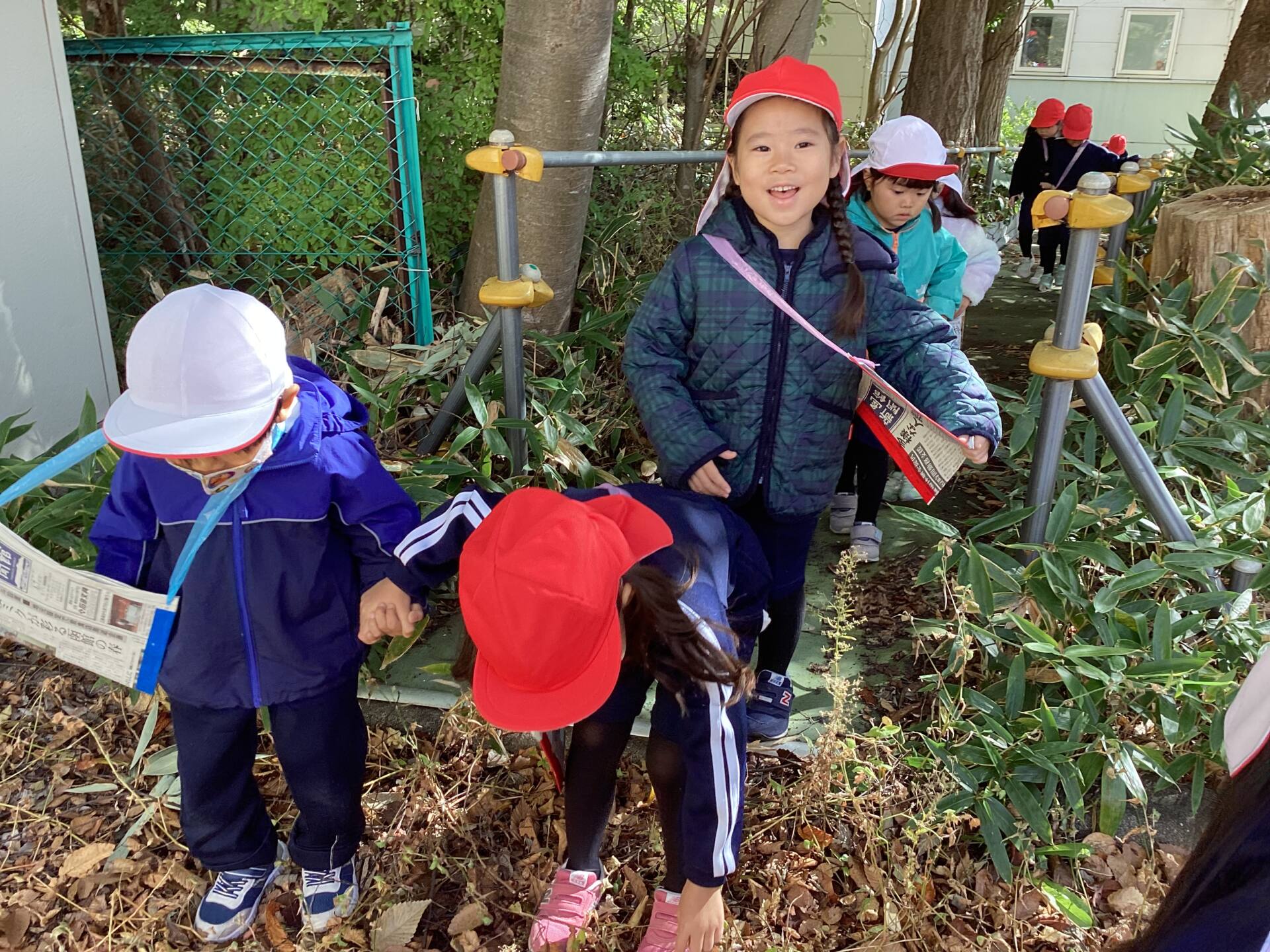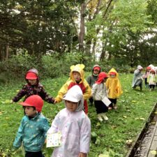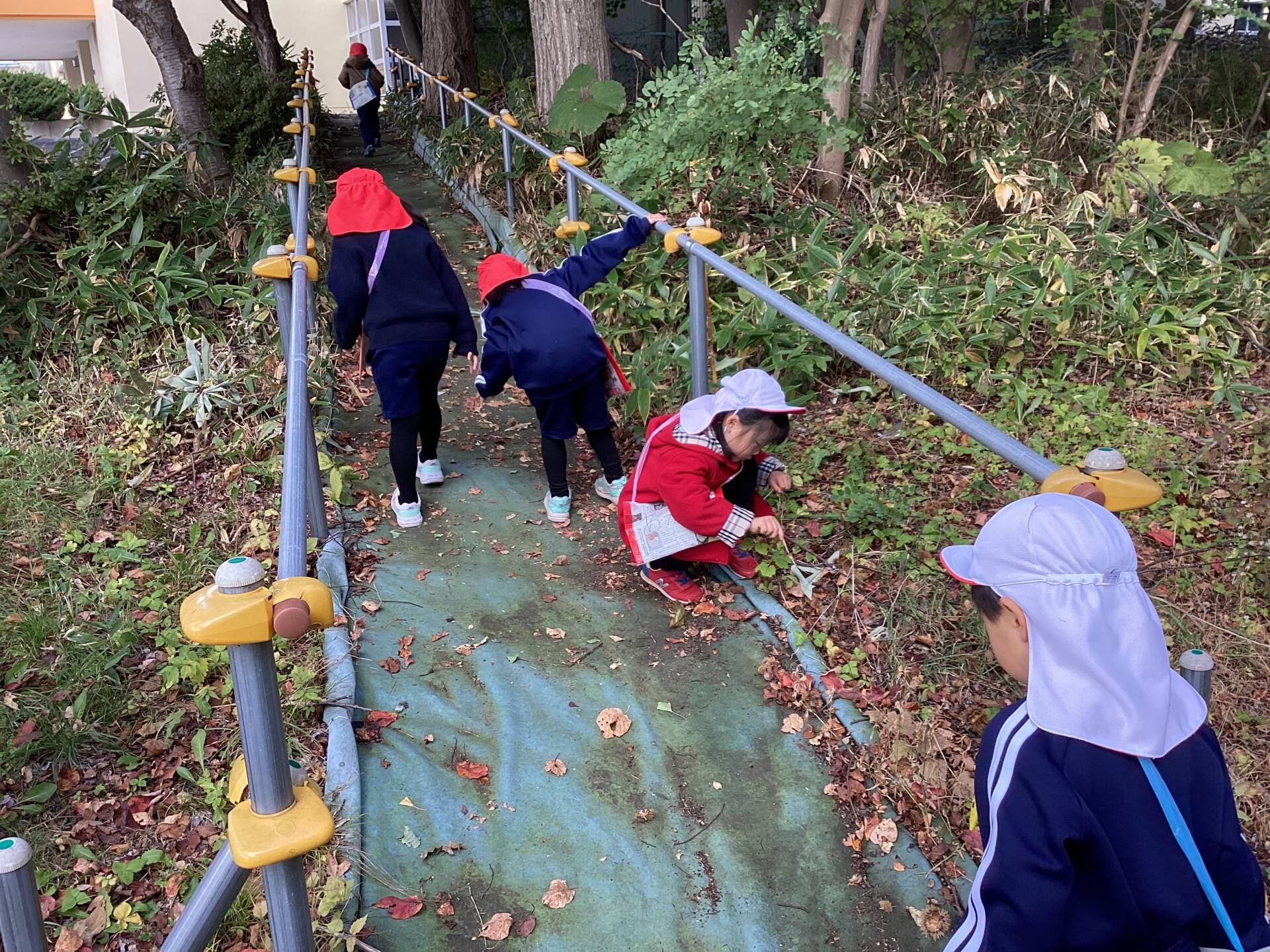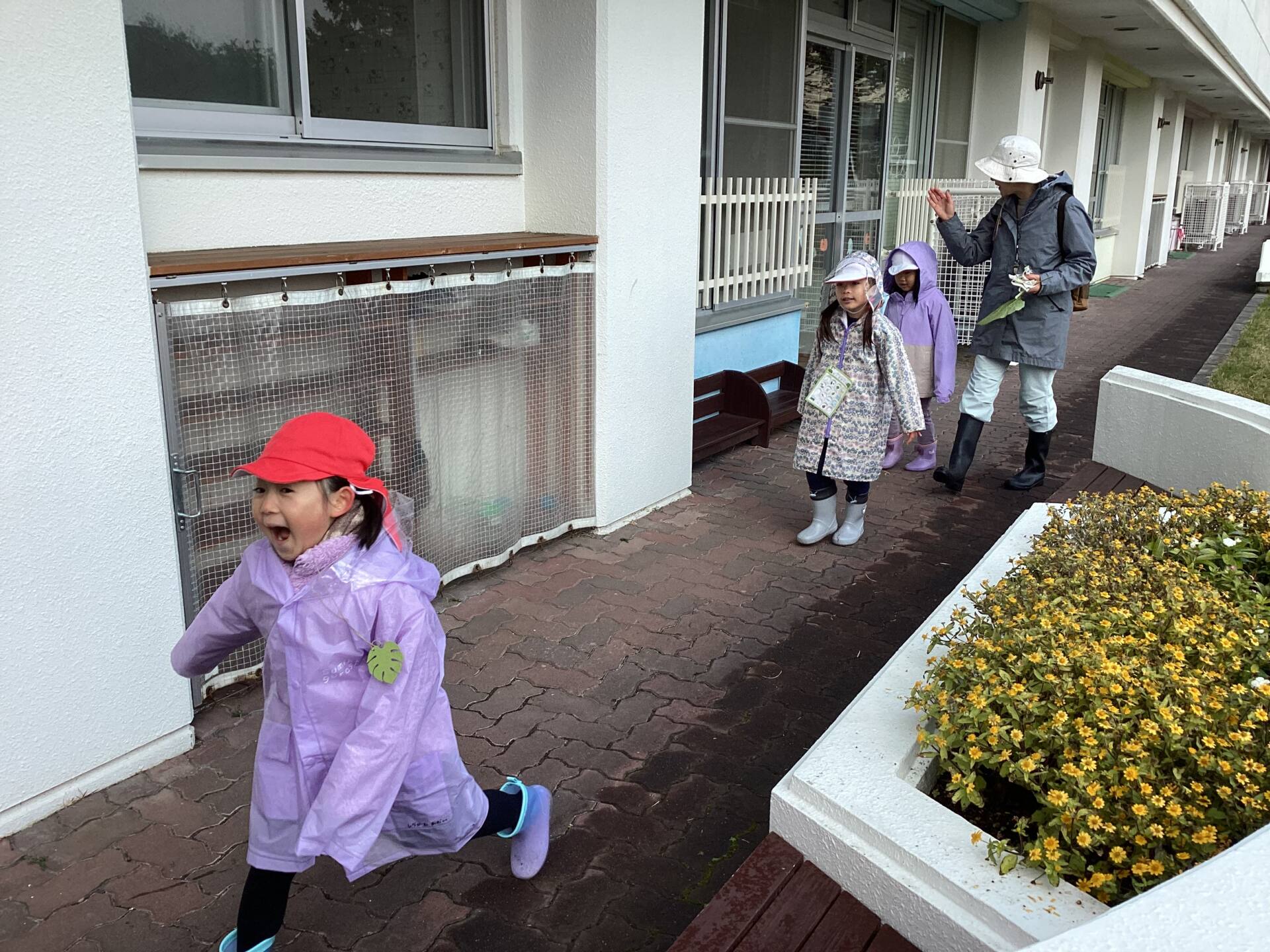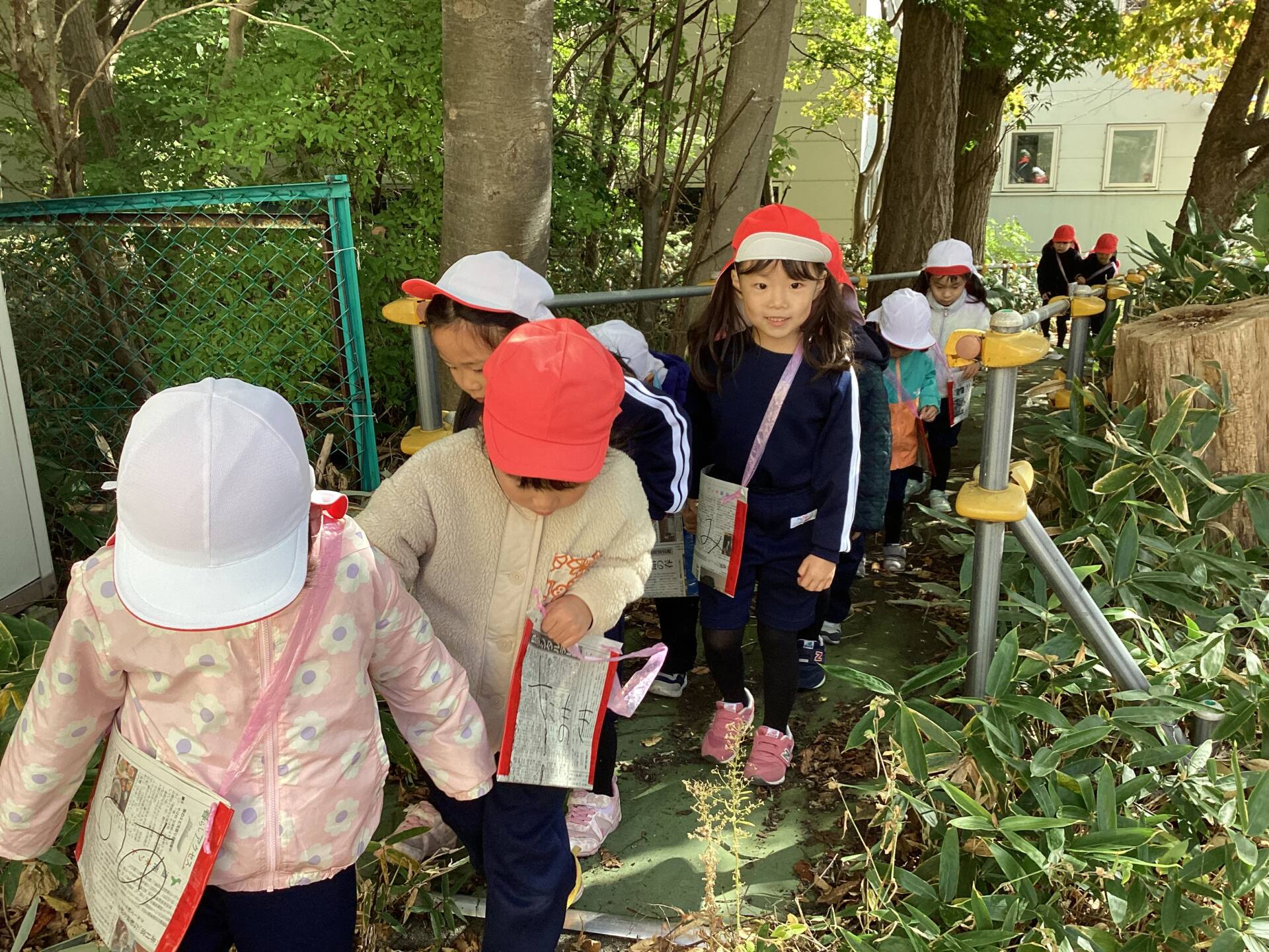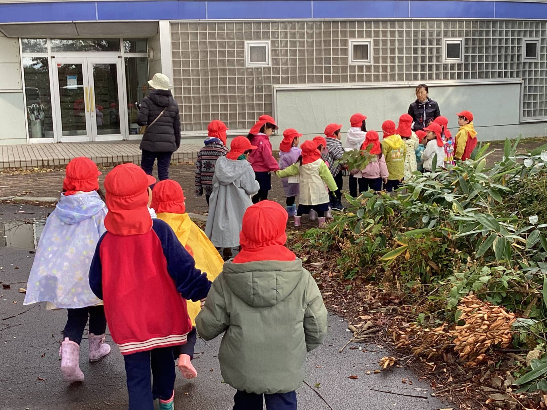 今日は年少.満3.年長児の森のようちえんが行われました。玉川大学から仁藤先生がいらっしゃって白百合の森に散策です♪朝は強い雨が降っていましたが、出発するときは青空が見えました。森に🌳到着すると雨が降ってきましたが、雨が降る中でのお散歩はとても良い経験となりました☆🌰綺麗に色が変わった葉🍃🍂🍃🍂風、雨の匂いなど様々な事を感じました。雨が強くなってきたので早めに切り上げましたが、🍁落ち葉を並べただけなのに綺麗なグラデーションができました。自然物を使って遊ぶ楽しさを知りました!