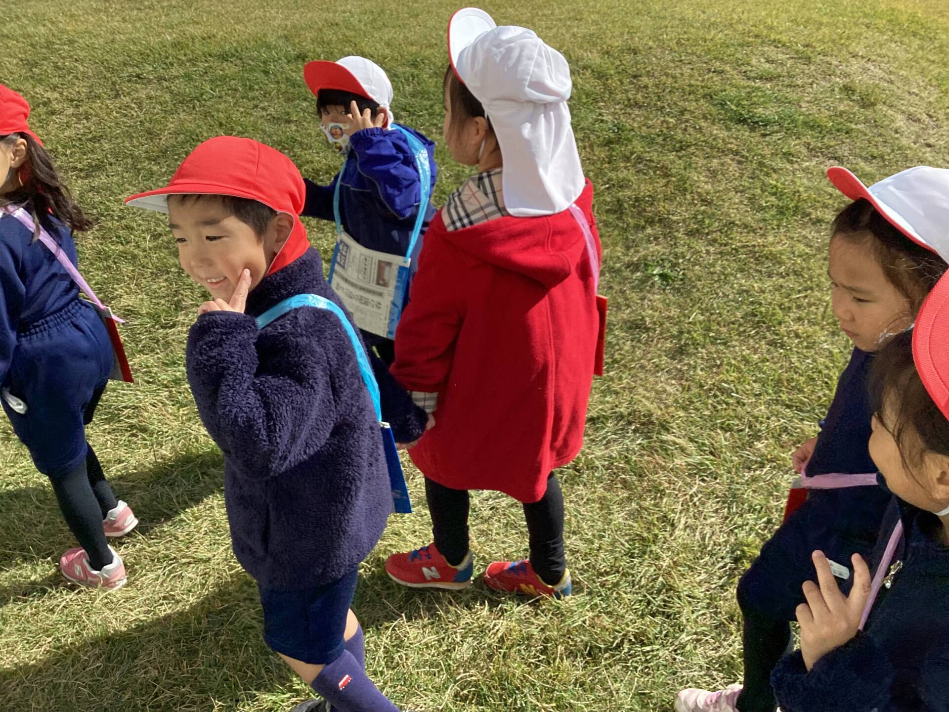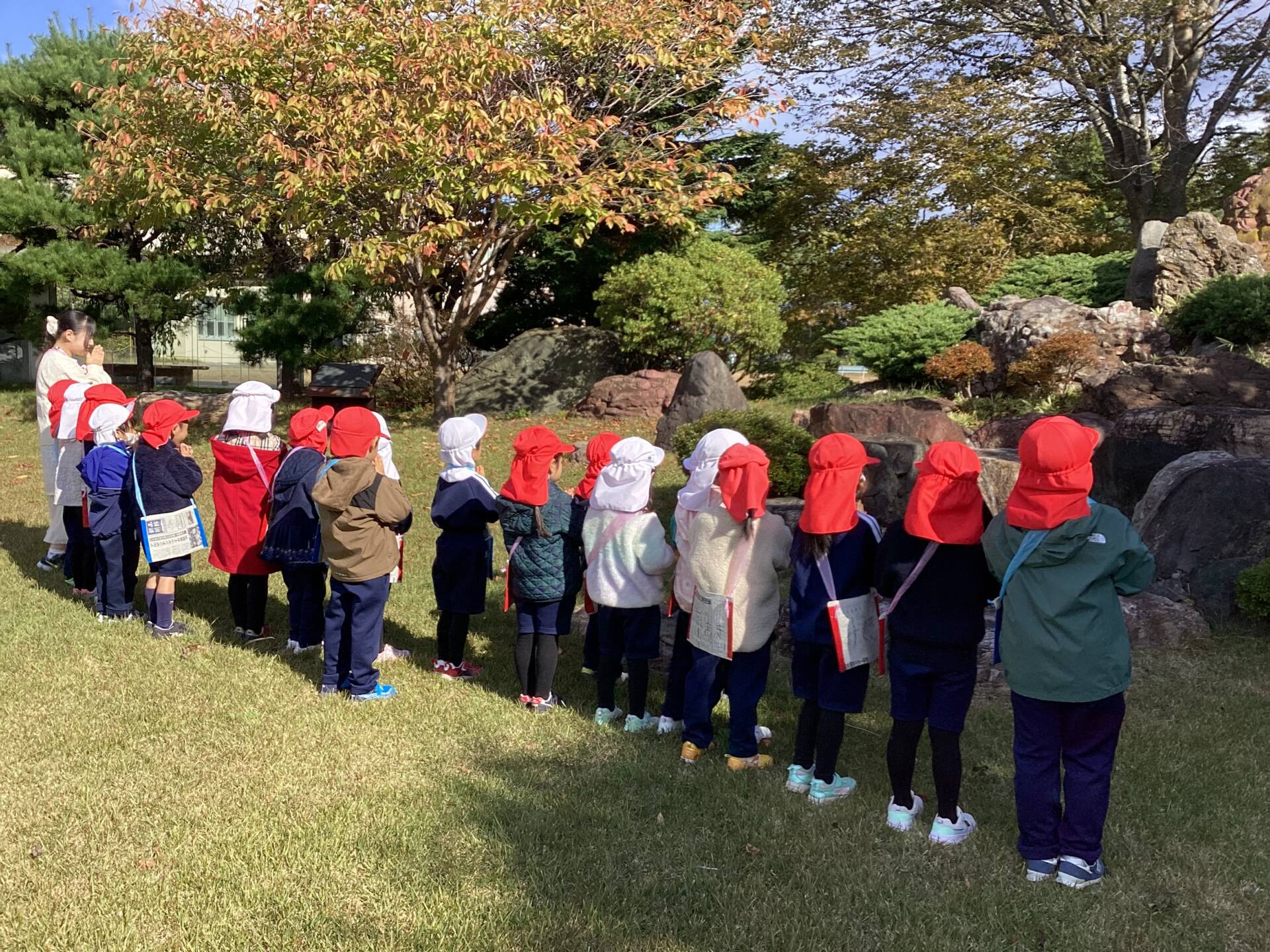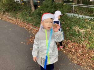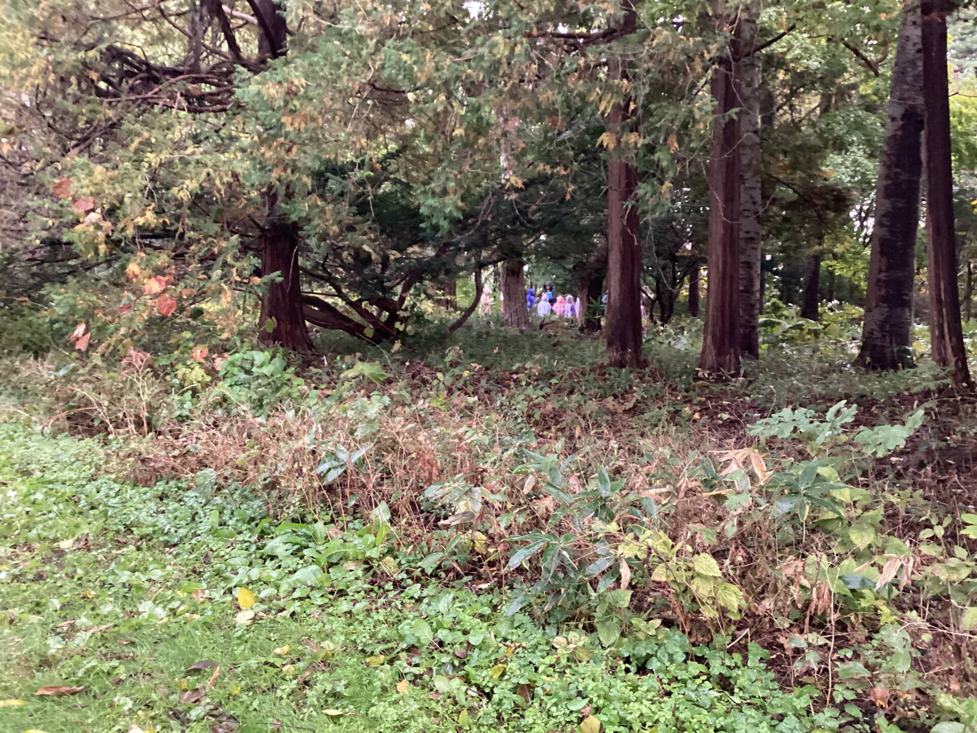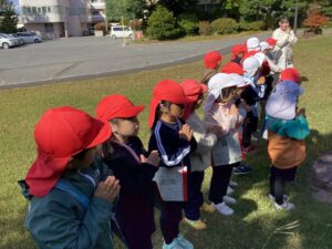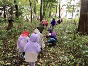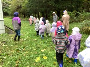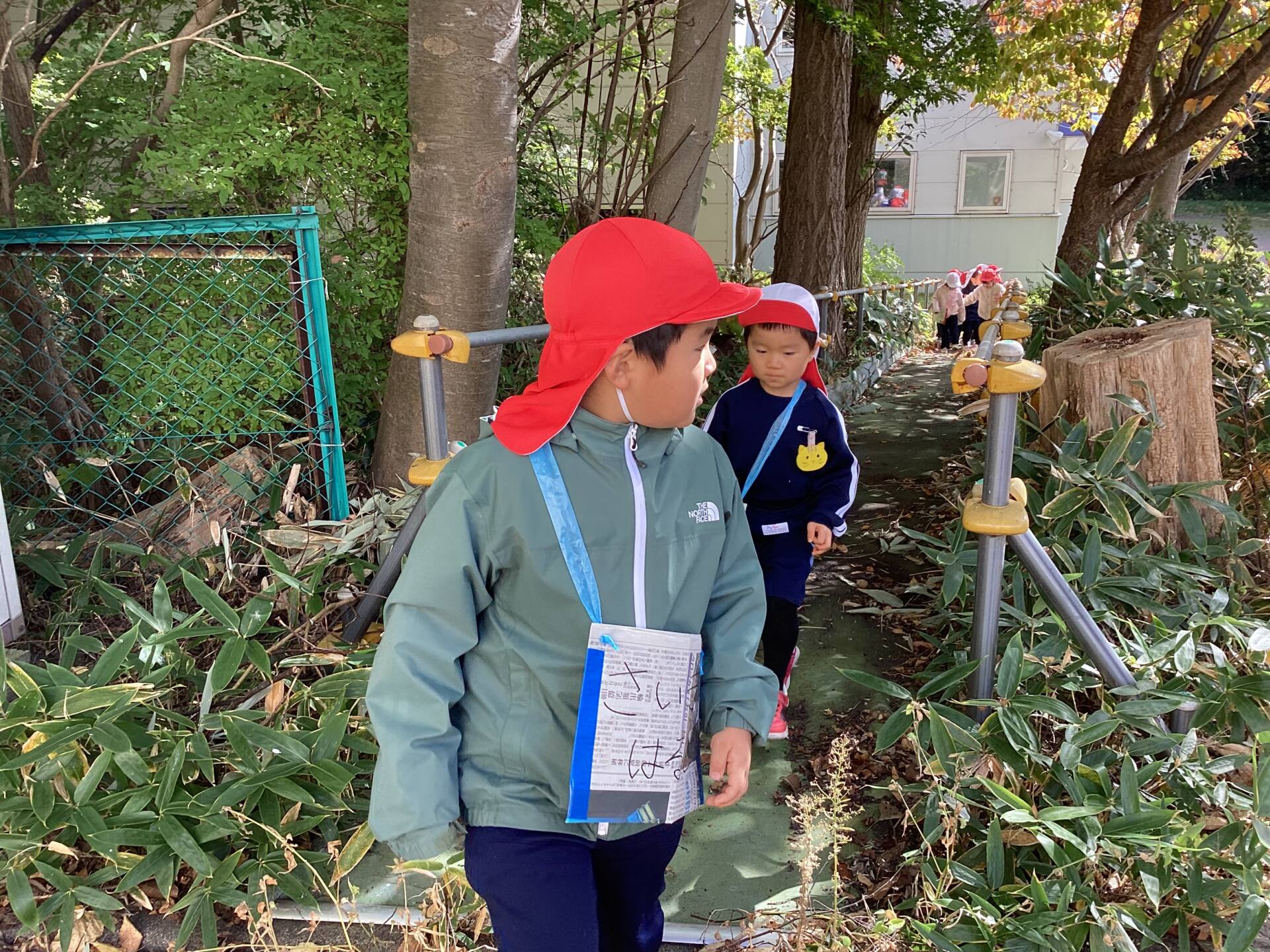今日は年少.満3.年長児の森のようちえんが行われました。玉川大学から仁藤先生がいらっしゃって白百合の森に散策です♪朝は強い雨が降っていましたが、出発するときは青空が見えました。森に🌳到着すると雨が降ってきましたが、雨が降る中でのお散歩はとても良い経験となりました☆🌰綺麗に色が変わった葉🍃🍂🍃🍂風、雨の匂いなど様々な事を感じました。雨が強くなってきたので早めに切り上げましたが、🍁落ち葉を並べただけなのに綺麗なグラデーションができました。自然物を使って遊ぶ楽しさを知りました!