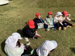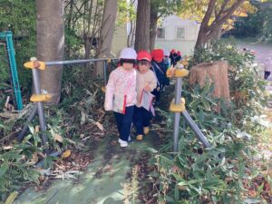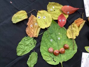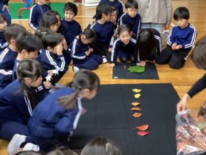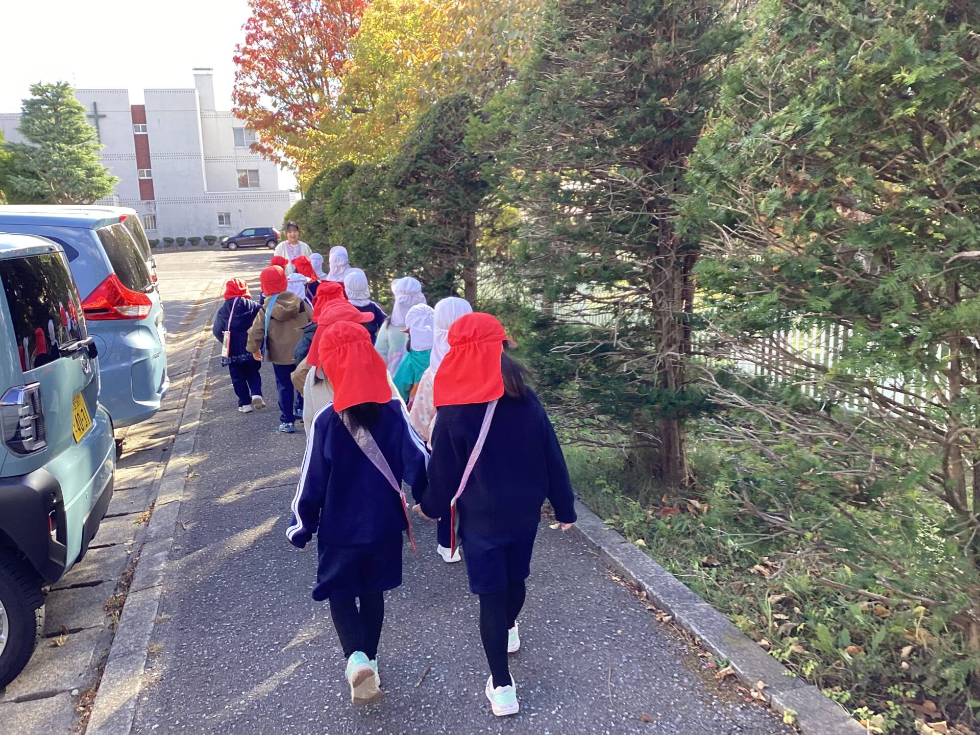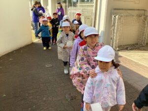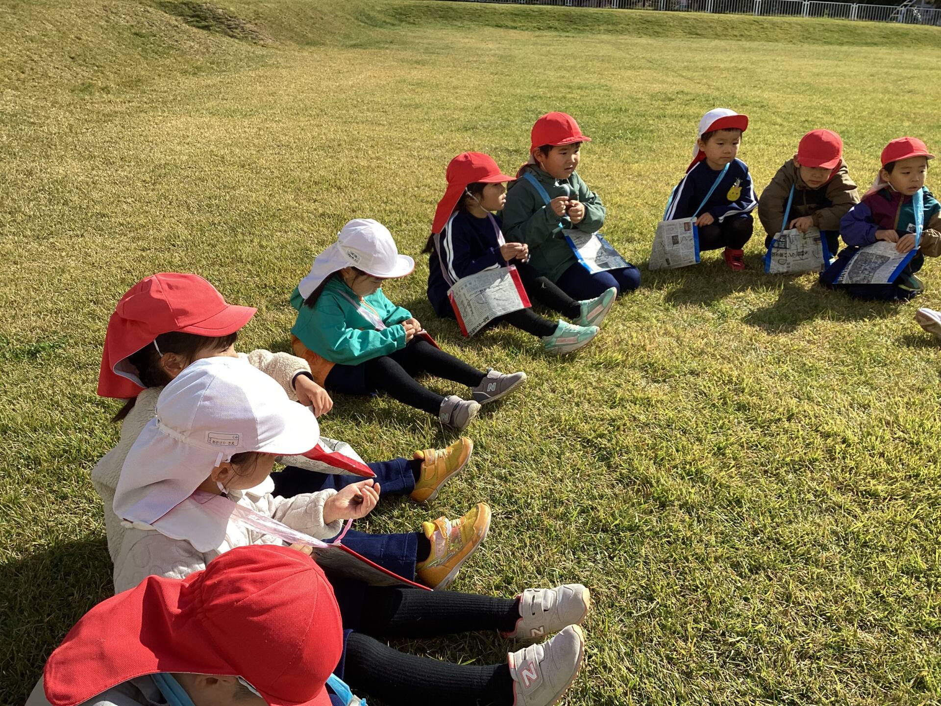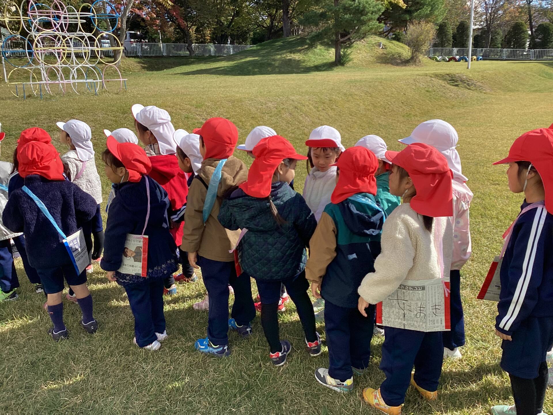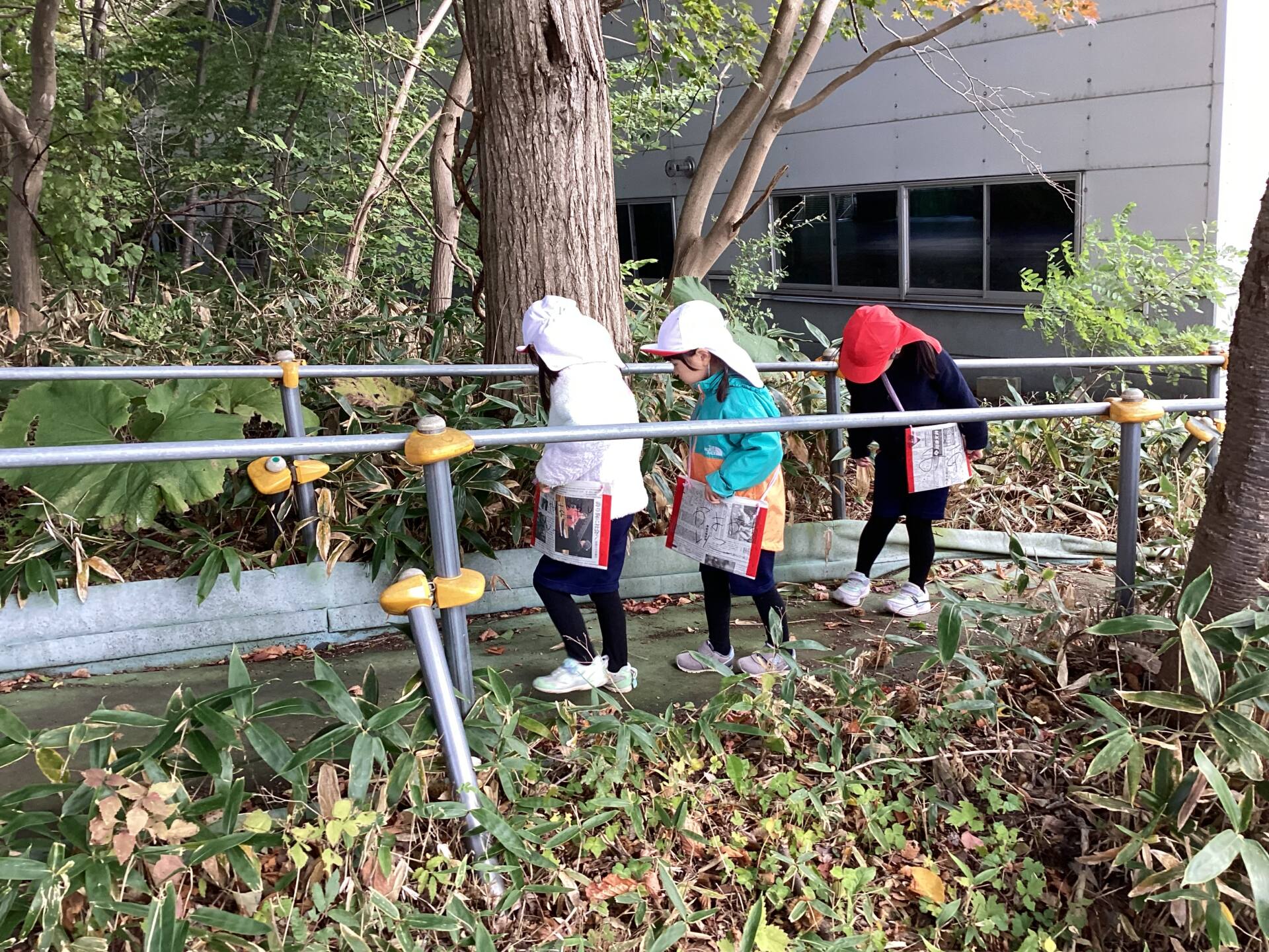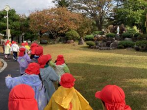 今日は年少.満3.年長児の森のようちえんが行われました。玉川大学から仁藤先生がいらっしゃって白百合の森に散策です♪朝は強い雨が降っていましたが、出発するときは青空が見えました。森に🌳到着すると雨が降ってきましたが、雨が降る中でのお散歩はとても良い経験となりました☆🌰綺麗に色が変わった葉🍃🍂🍃🍂風、雨の匂いなど様々な事を感じました。雨が強くなってきたので早めに切り上げましたが、🍁落ち葉を並べただけなのに綺麗なグラデーションができました。自然物を使って遊ぶ楽しさを知りました!