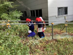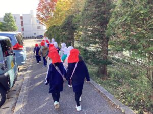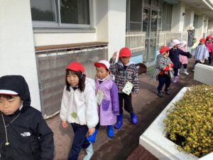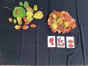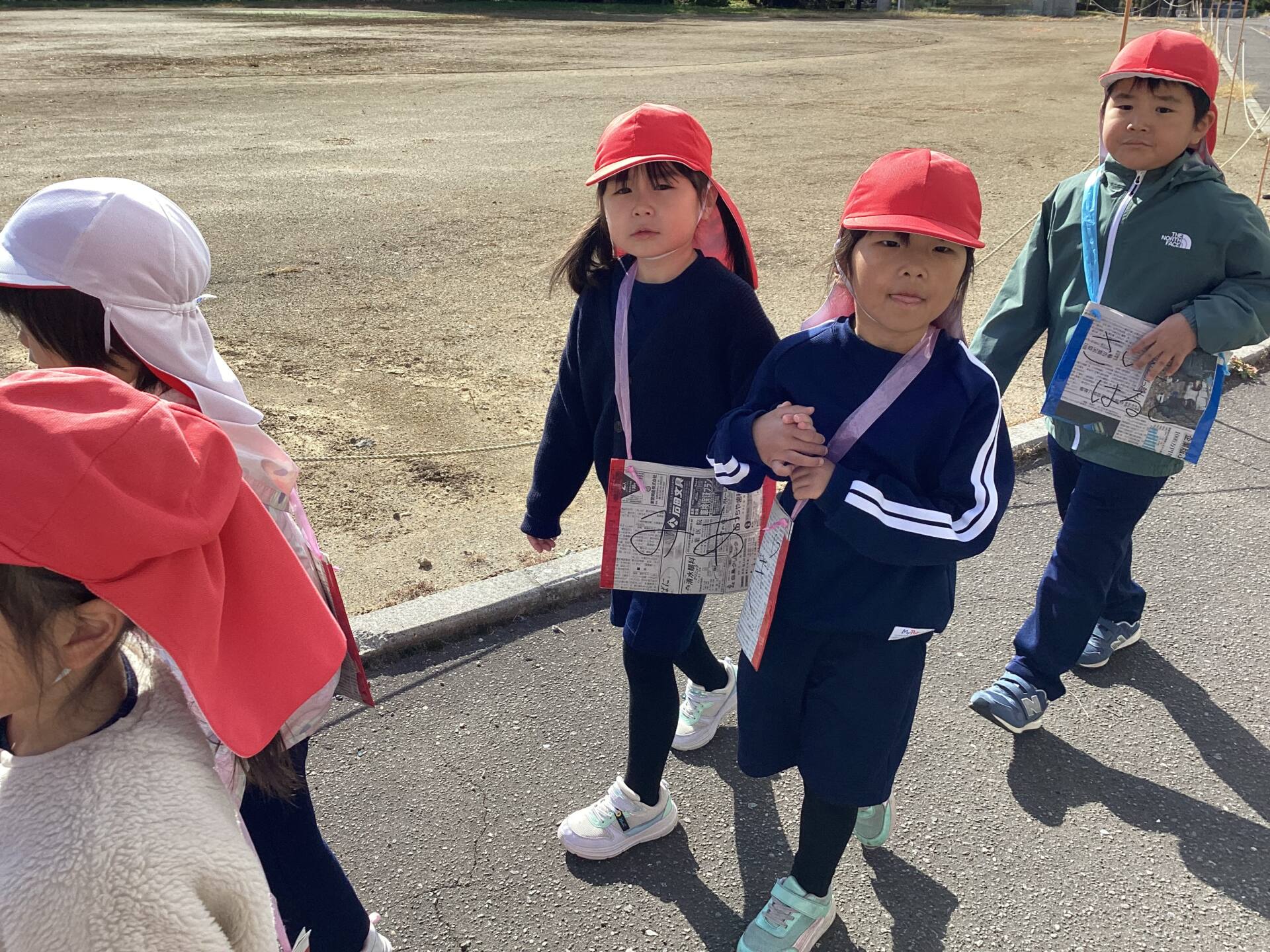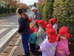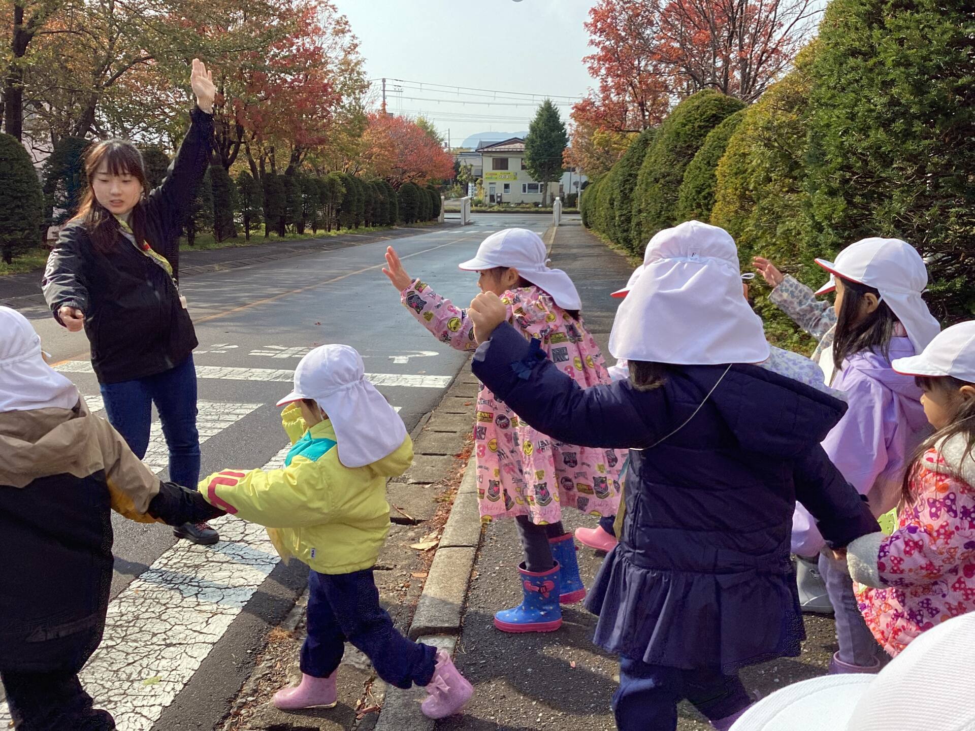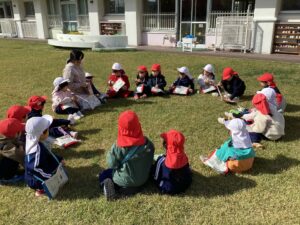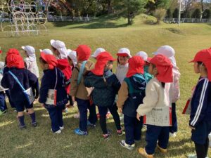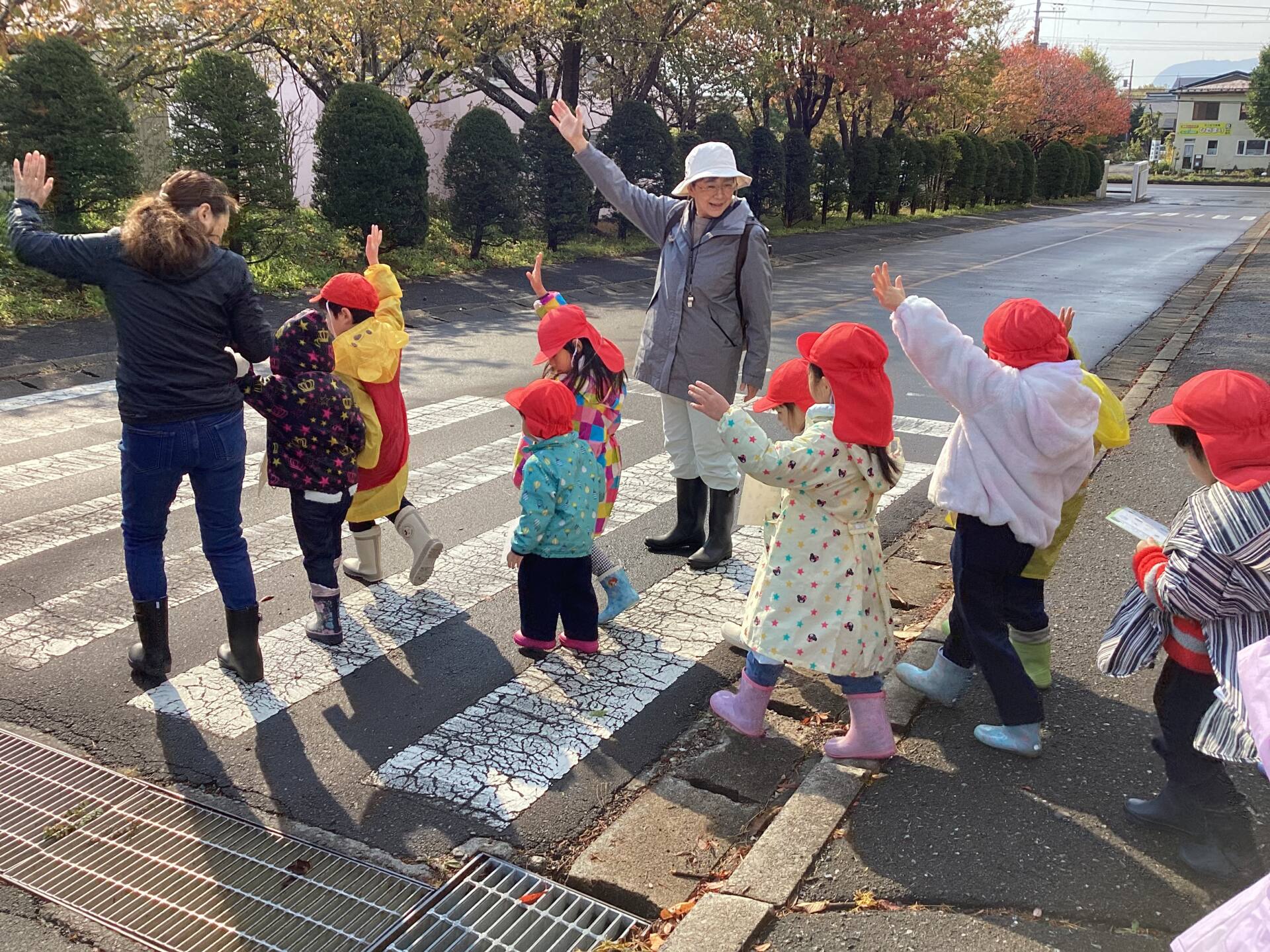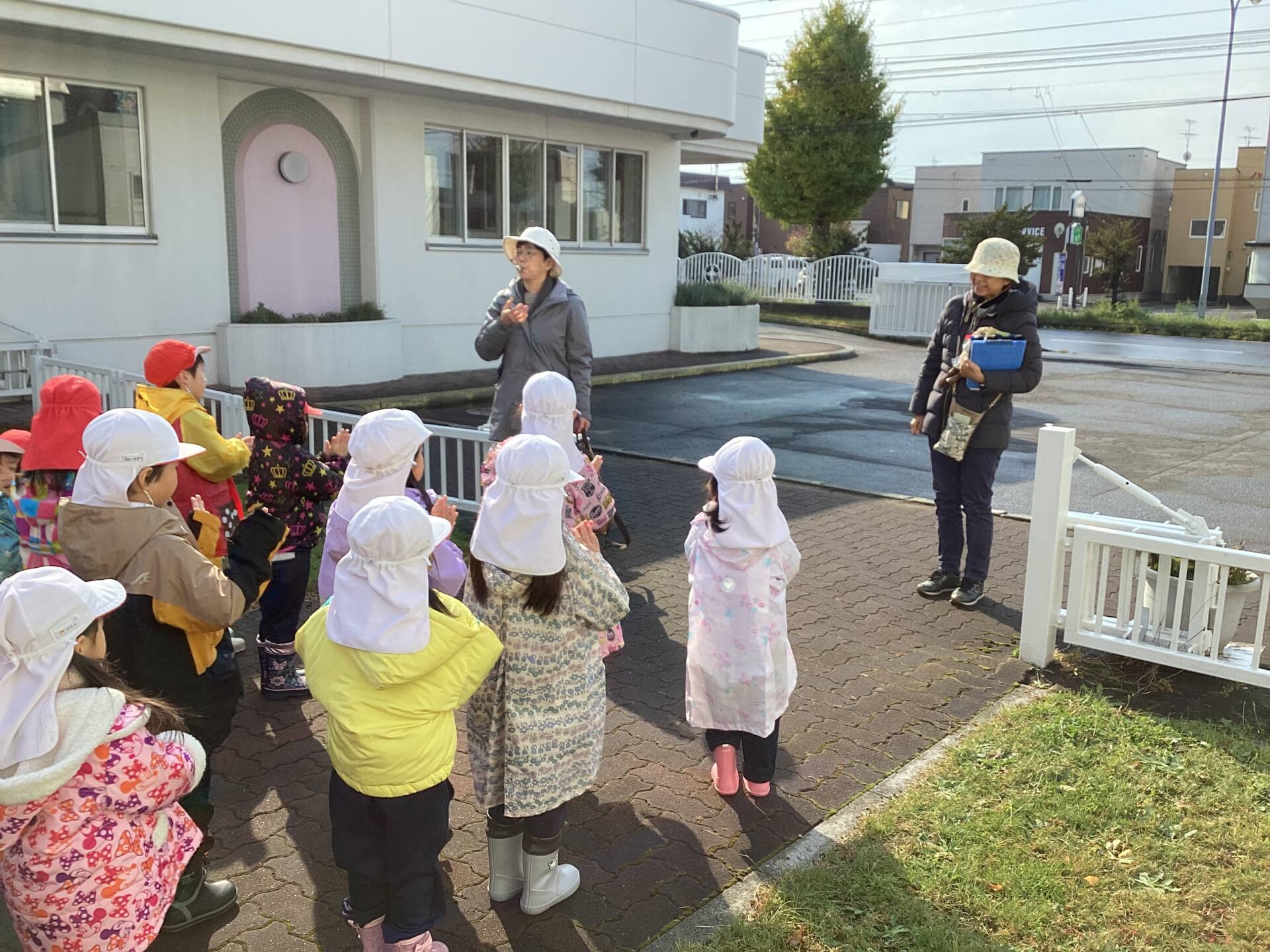 今日は年少.満3.年長児の森のようちえんが行われました。玉川大学から仁藤先生がいらっしゃって白百合の森に散策です♪朝は強い雨が降っていましたが、出発するときは青空が見えました。森に🌳到着すると雨が降ってきましたが、雨が降る中でのお散歩はとても良い経験となりました☆🌰綺麗に色が変わった葉🍃🍂🍃🍂風、雨の匂いなど様々な事を感じました。雨が強くなってきたので早めに切り上げましたが、🍁落ち葉を並べただけなのに綺麗なグラデーションができました。自然物を使って遊ぶ楽しさを知りました!