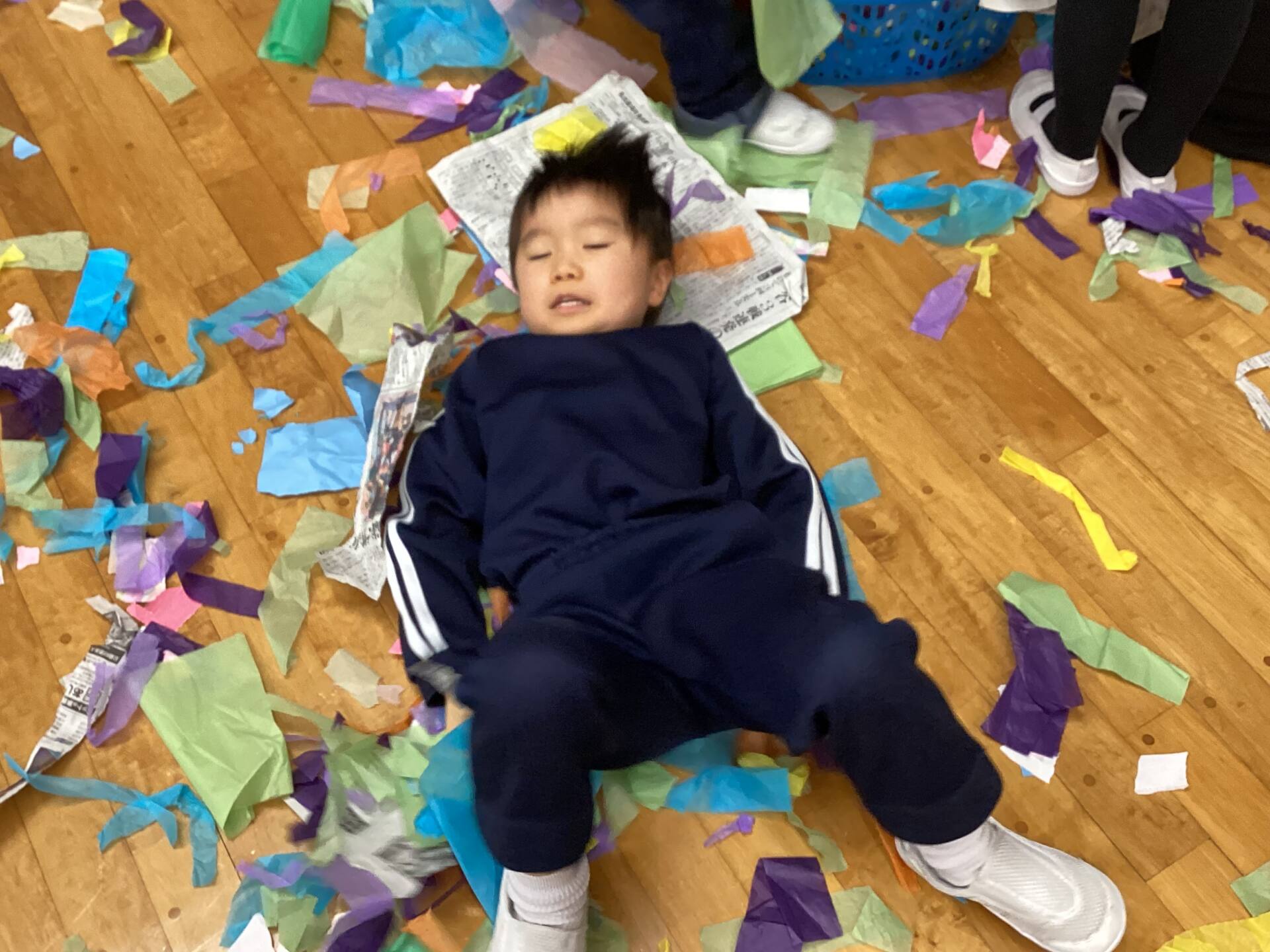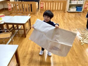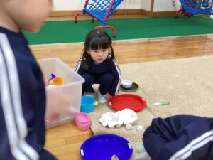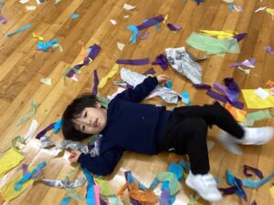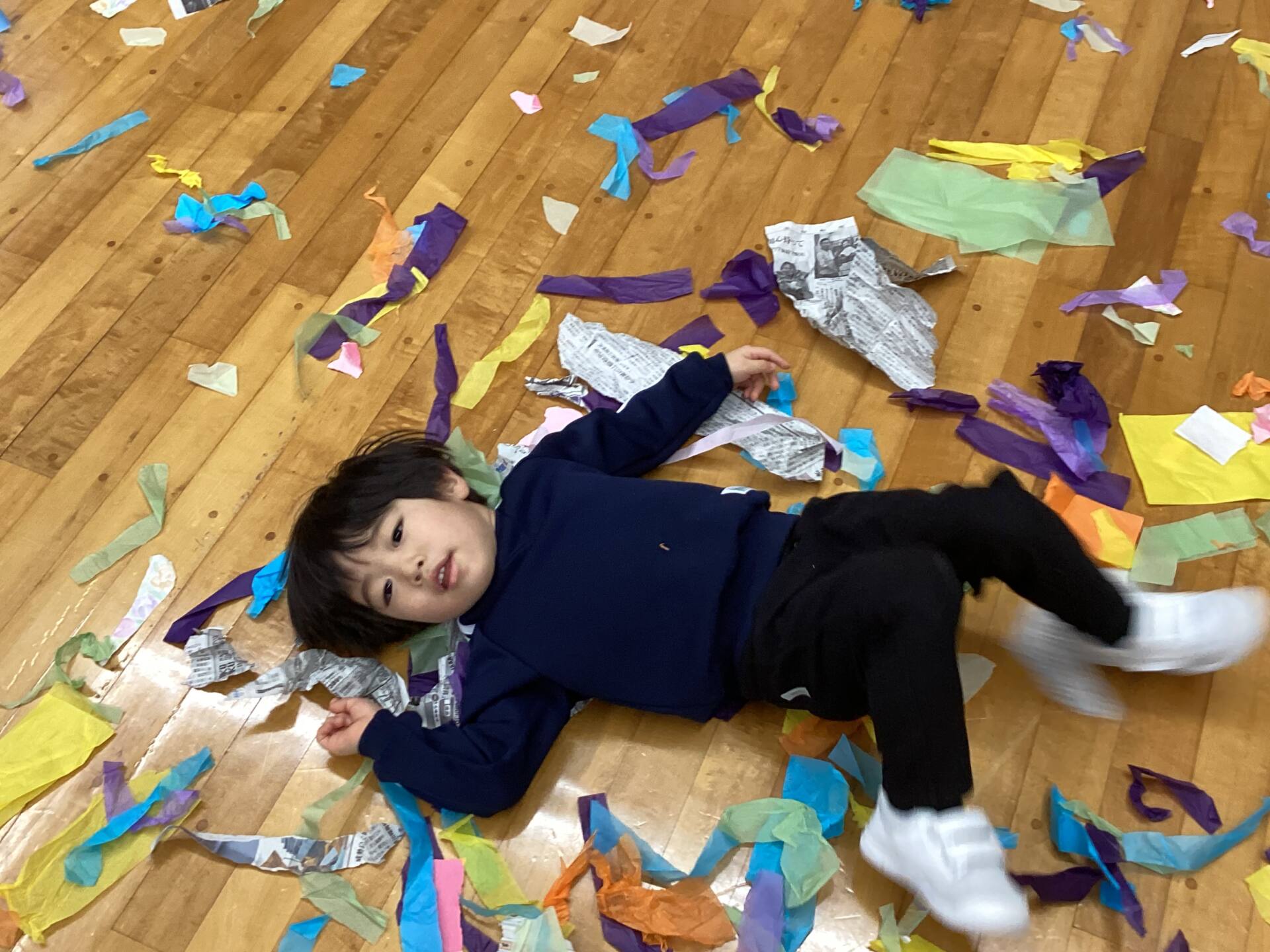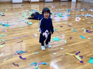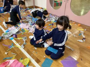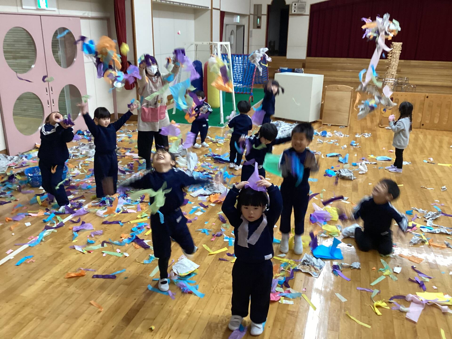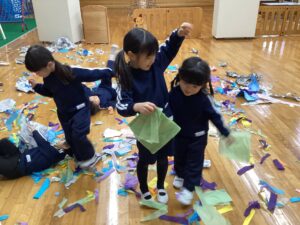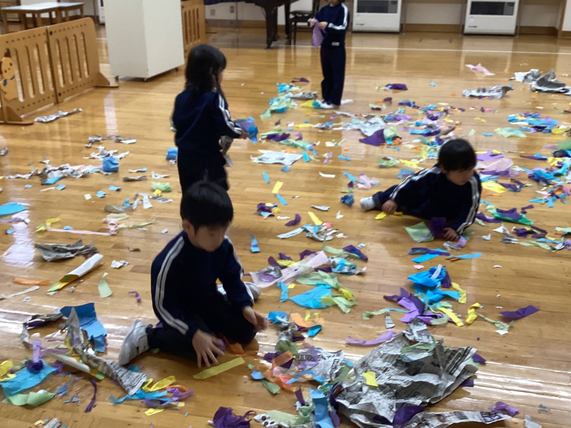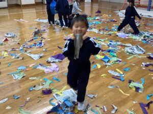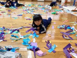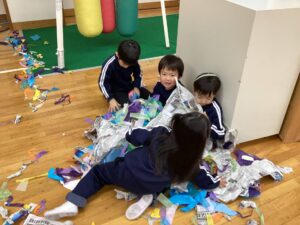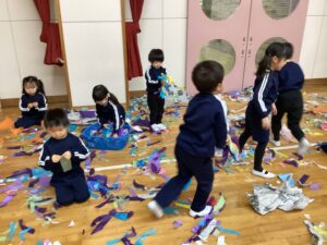 冬休みに入っても雪が積もりません❄️でも元気いっぱい体を動かして遊んでいます😄朝はカプラ積み、ママごと、ブロックで遊びました🍝🍜🍔11時からは皆んなで新聞や包装紙をちぎって雪をつくりました❄️カラフルな雪に❄️大喜び🩵明日はクリスマス🎄で休園です♪