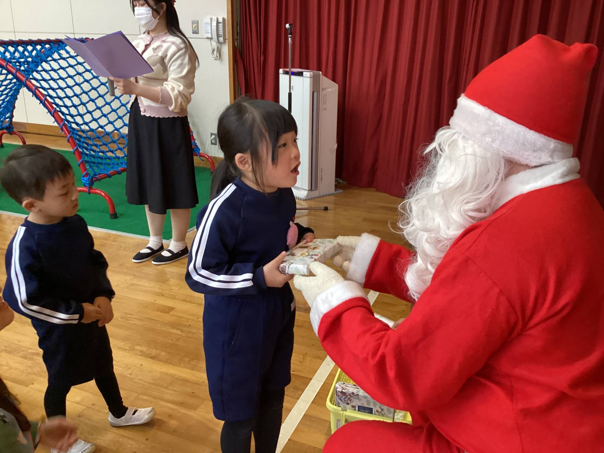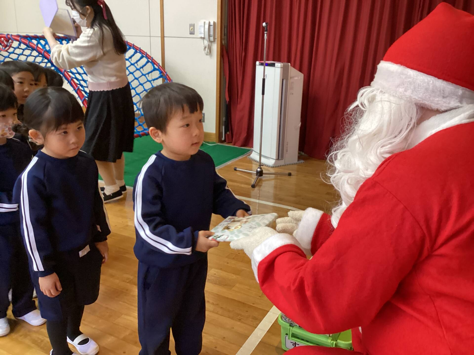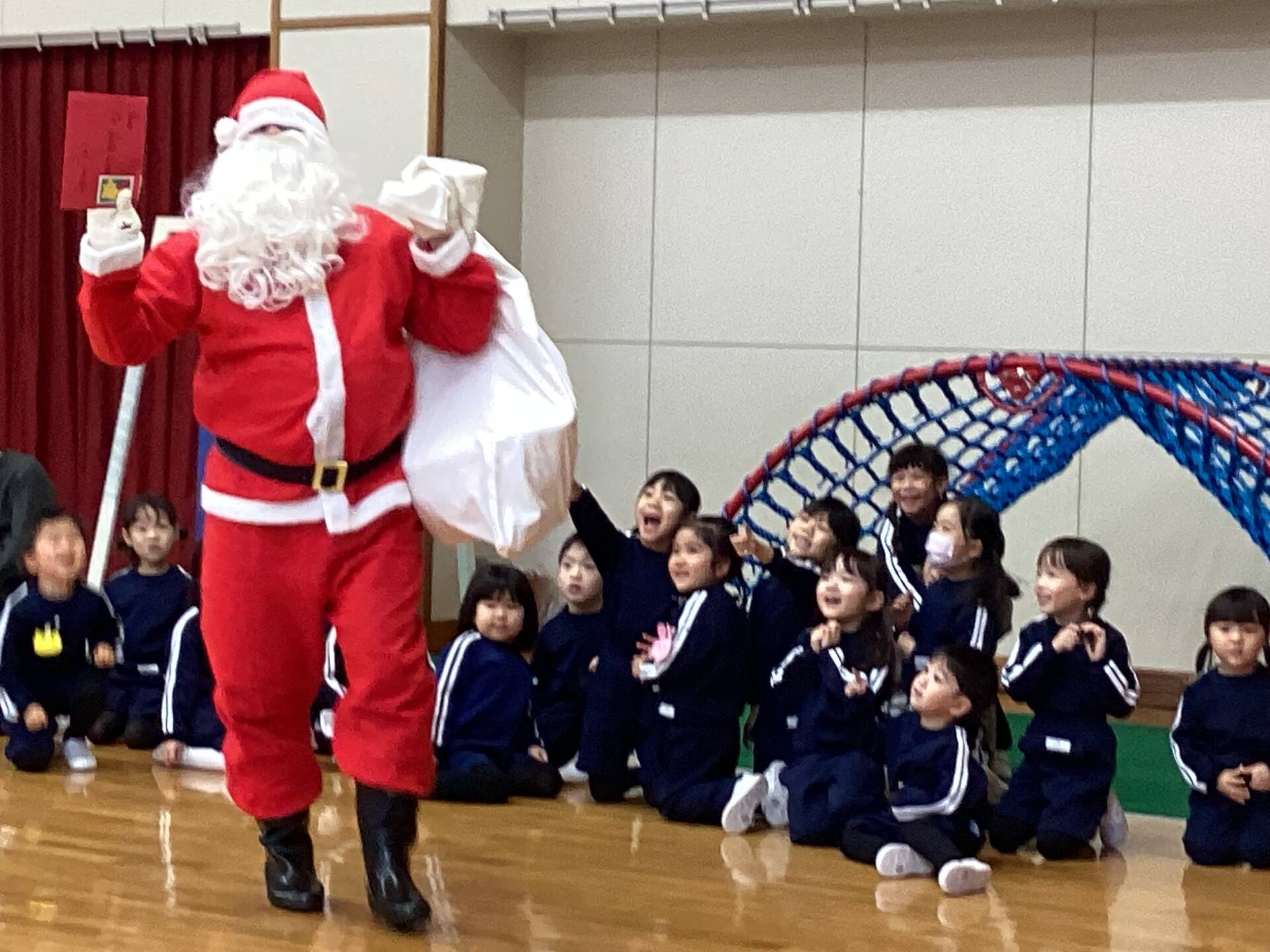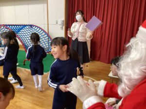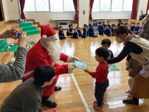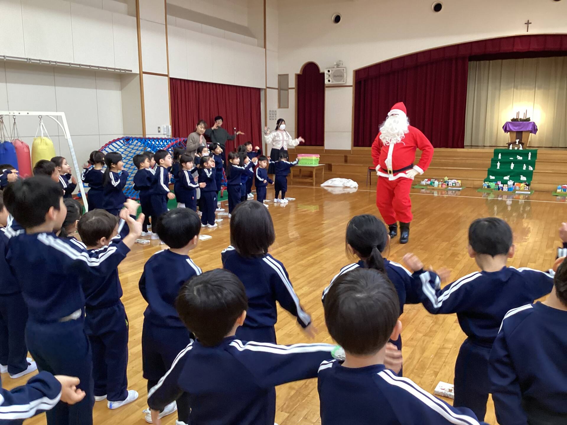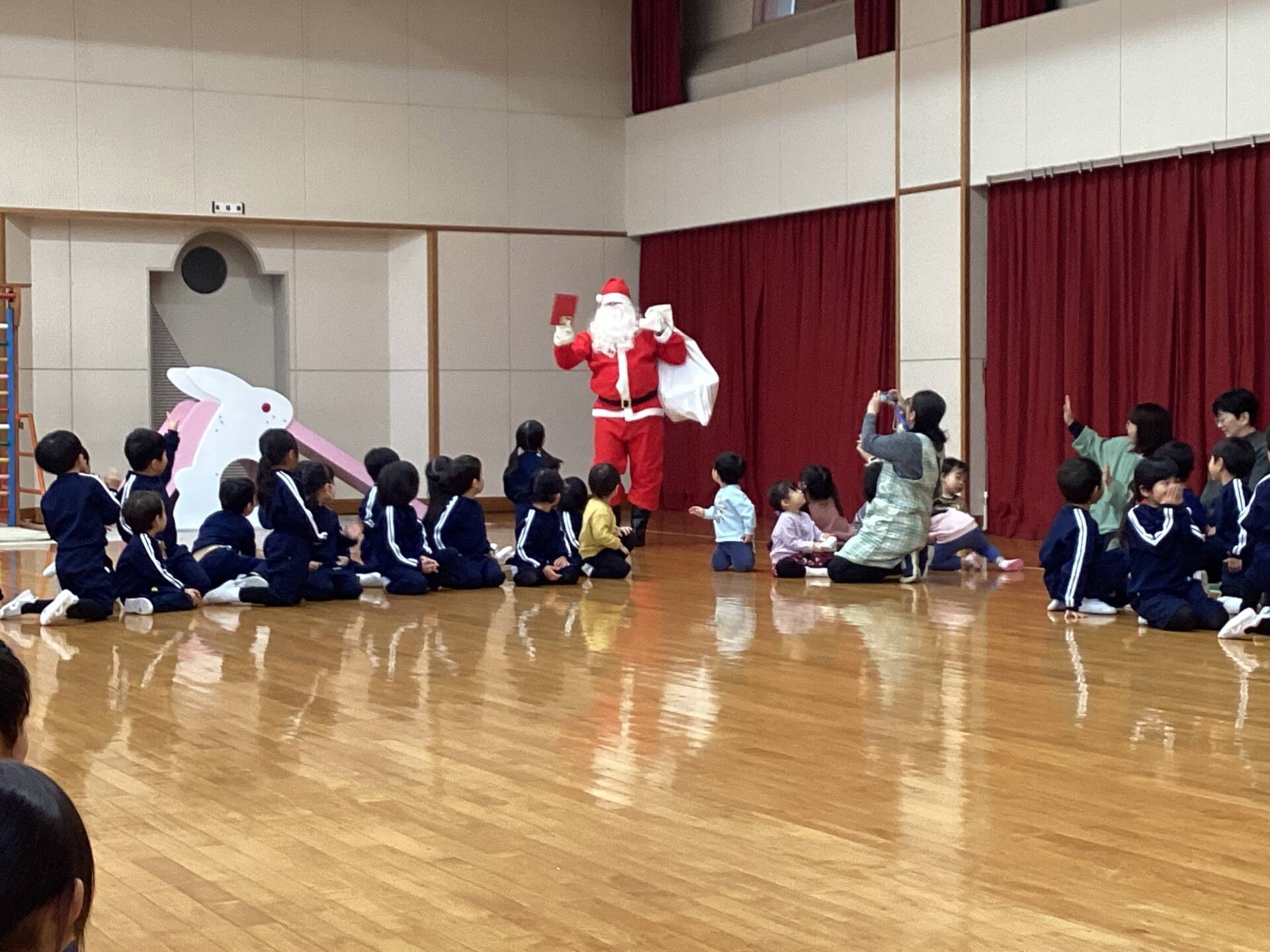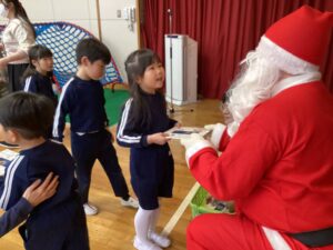 祭壇のリースも3本の火が灯り皆んなの心も温かくなりましたね🕯️✨🙏お祈りの後は、何とサンタ🎅さんが登場してプレゼントを渡して下さいました。園長先生がサンタさんに幼稚園に遊びにきてくださるように頼んでくださったそうですよ!嬉しかったですね‼️