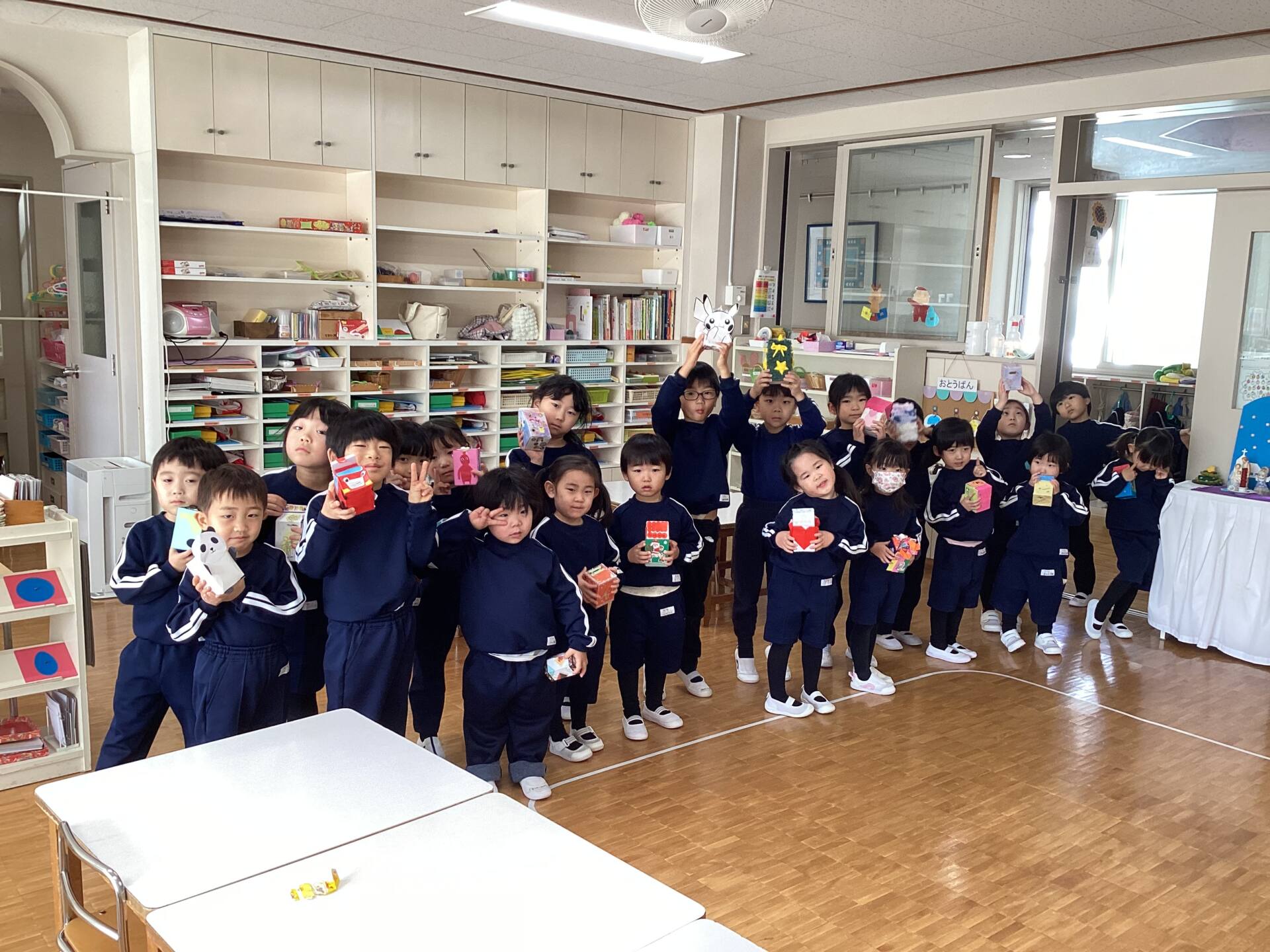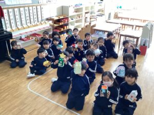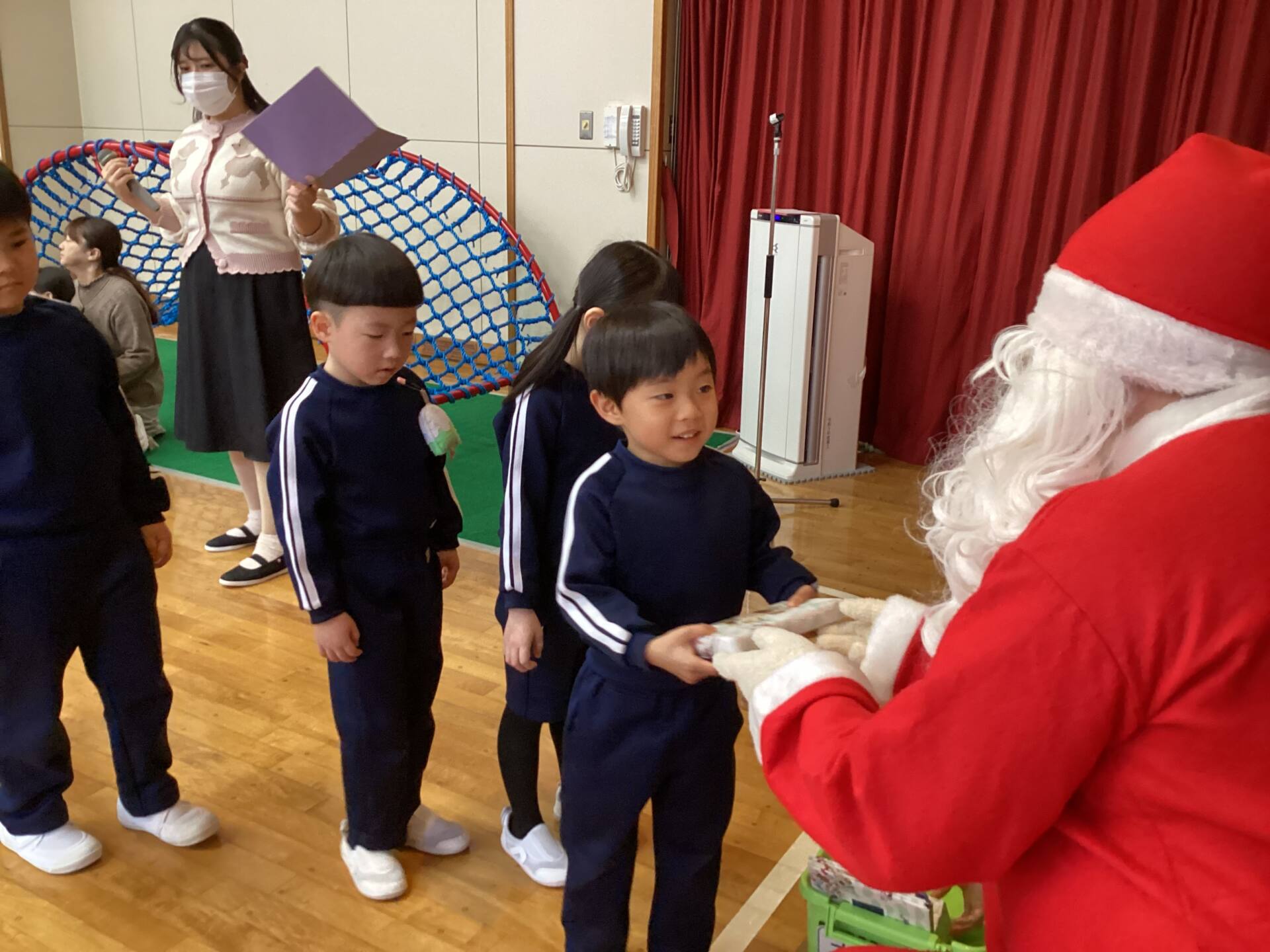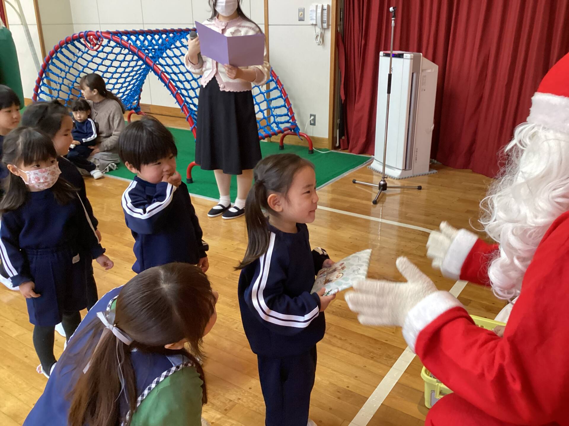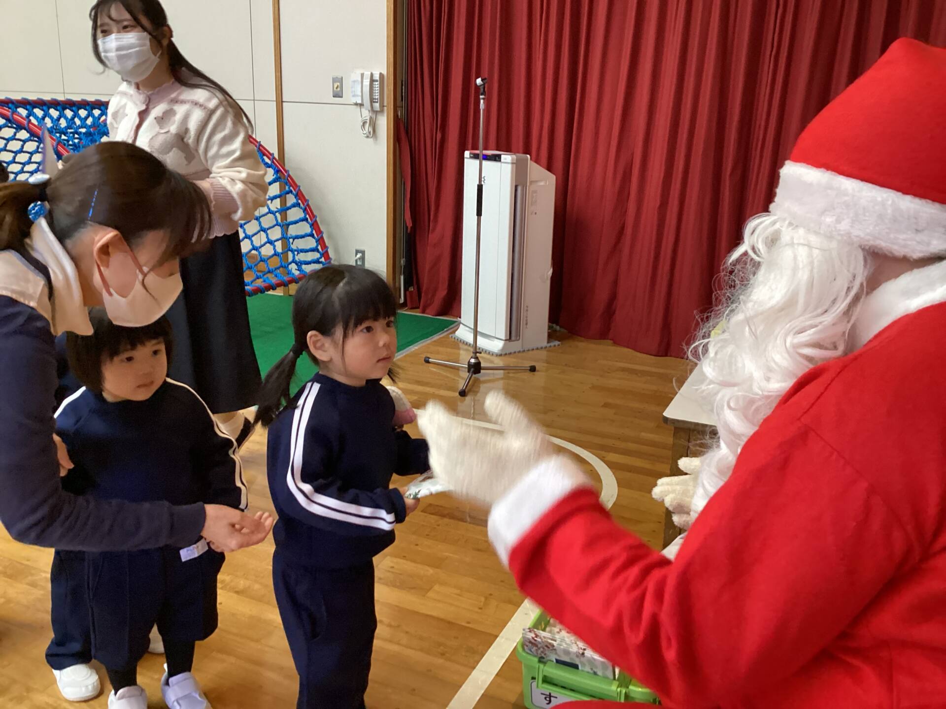 祭壇のリースも3本の火が灯り皆んなの心も温かくなりましたね🕯️✨🙏お祈りの後は、何とサンタ🎅さんが登場してプレゼントを渡して下さいました。園長先生がサンタさんに幼稚園に遊びにきてくださるように頼んでくださったそうですよ!嬉しかったですね‼️