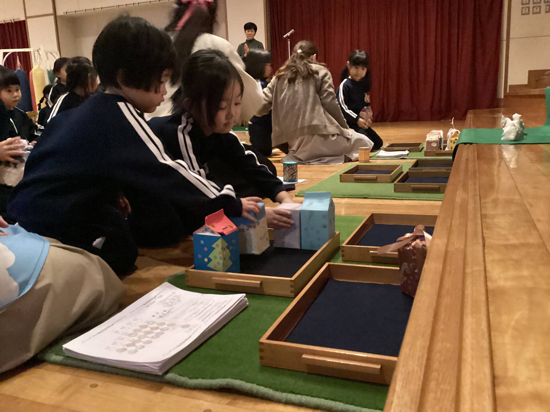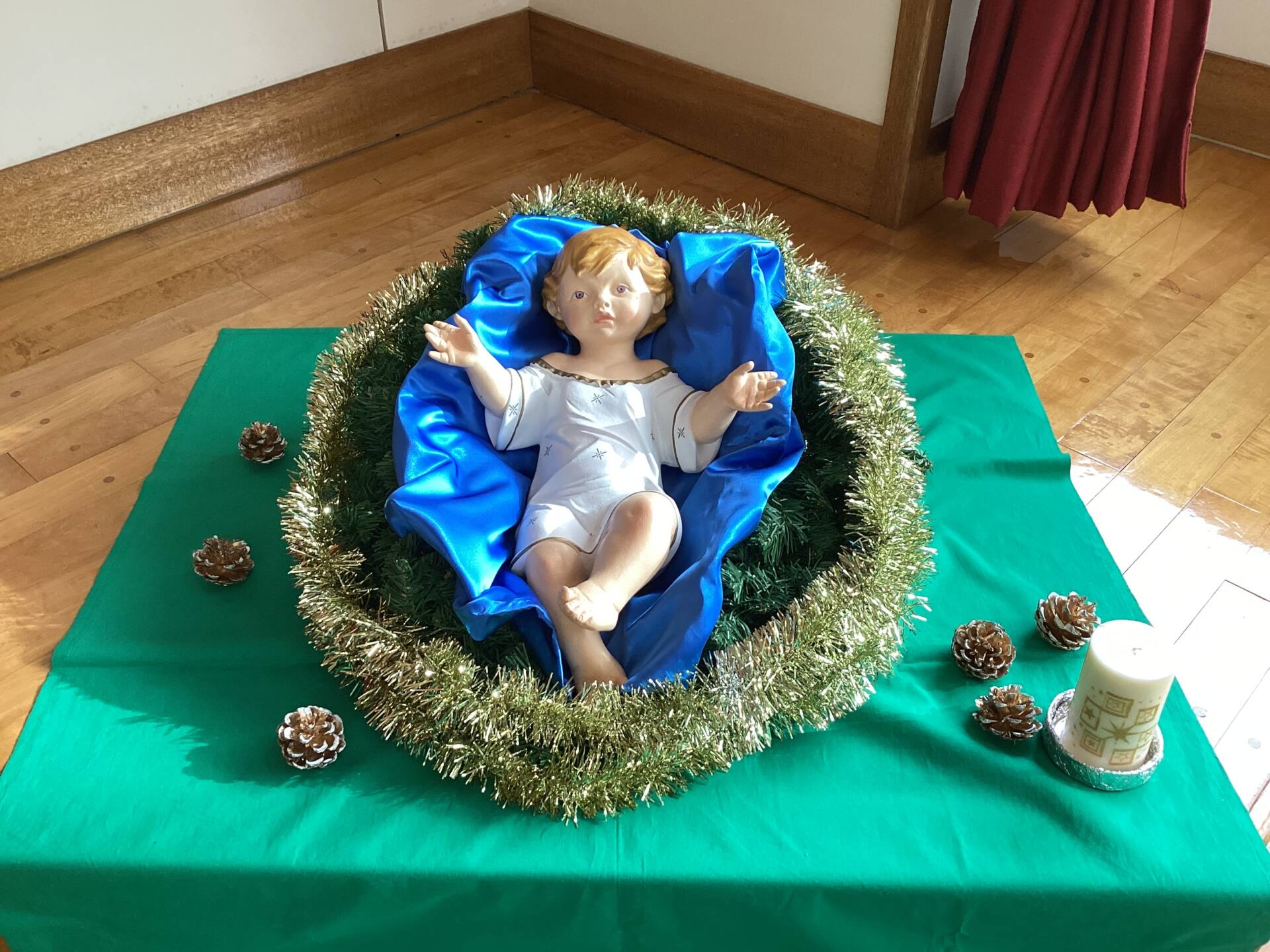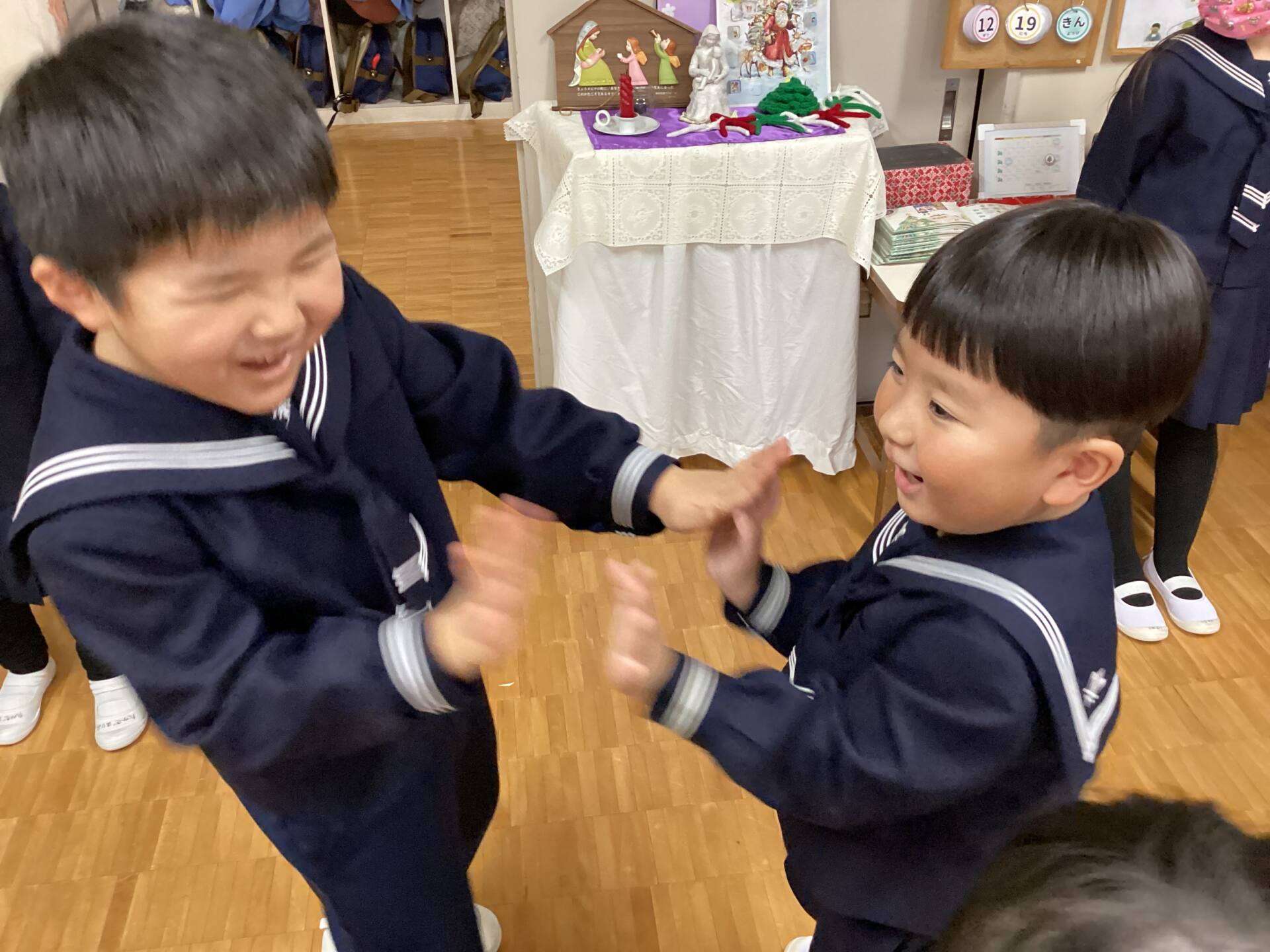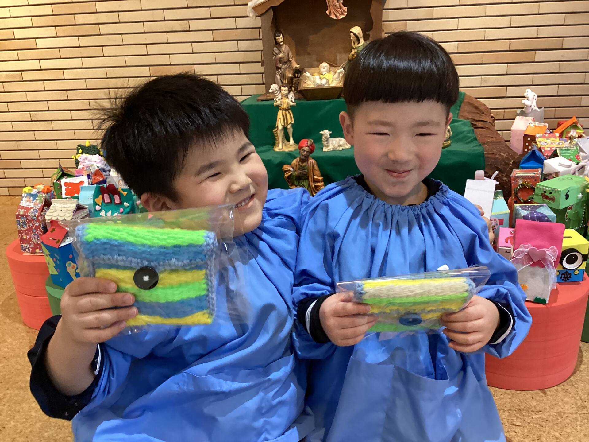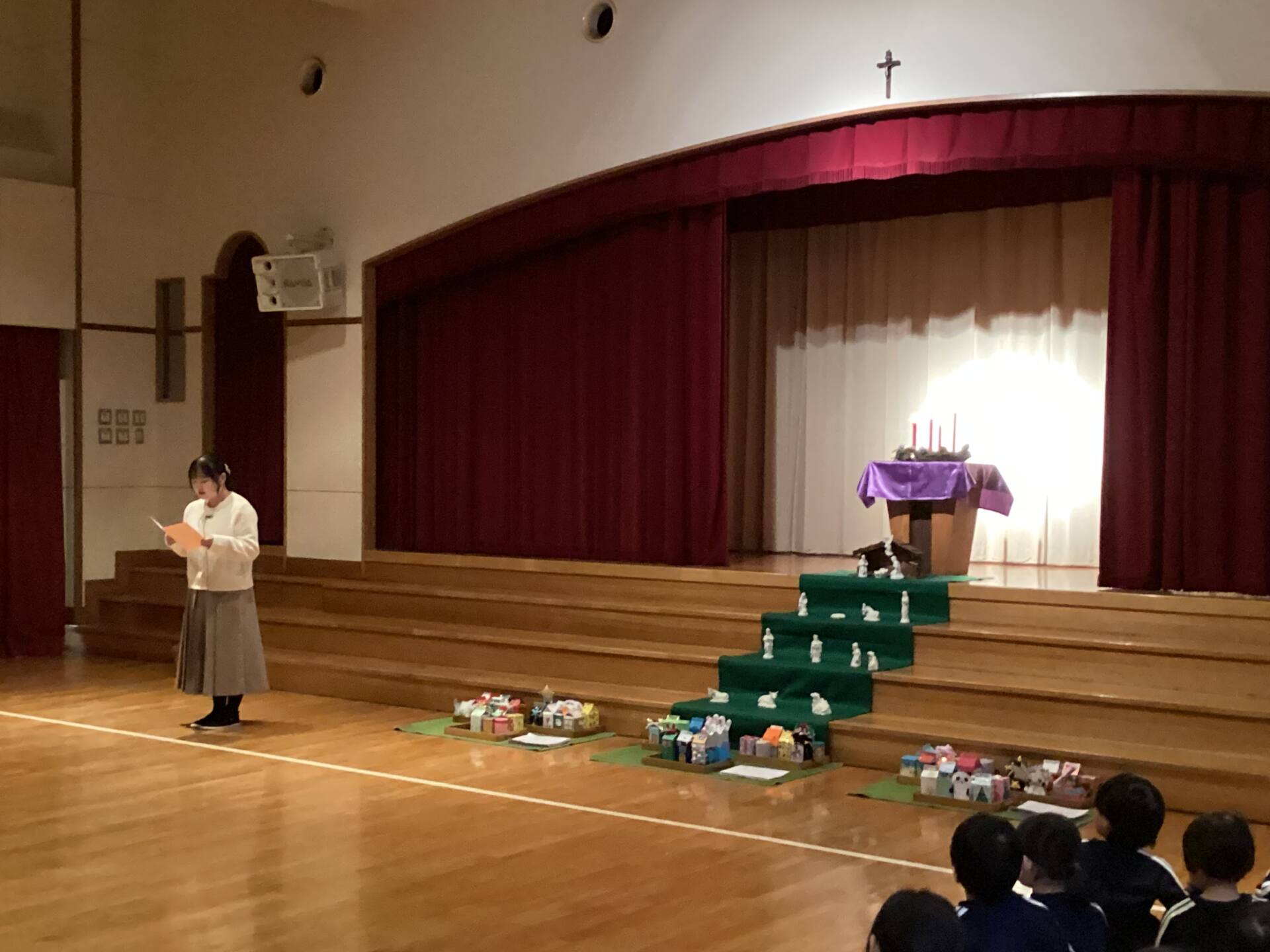 祭壇のリースも3本の火が灯り皆んなの心も温かくなりましたね🕯️✨🙏お祈りの後は、何とサンタ🎅さんが登場してプレゼントを渡して下さいました。園長先生がサンタさんに幼稚園に遊びにきてくださるように頼んでくださったそうですよ!嬉しかったですね‼️