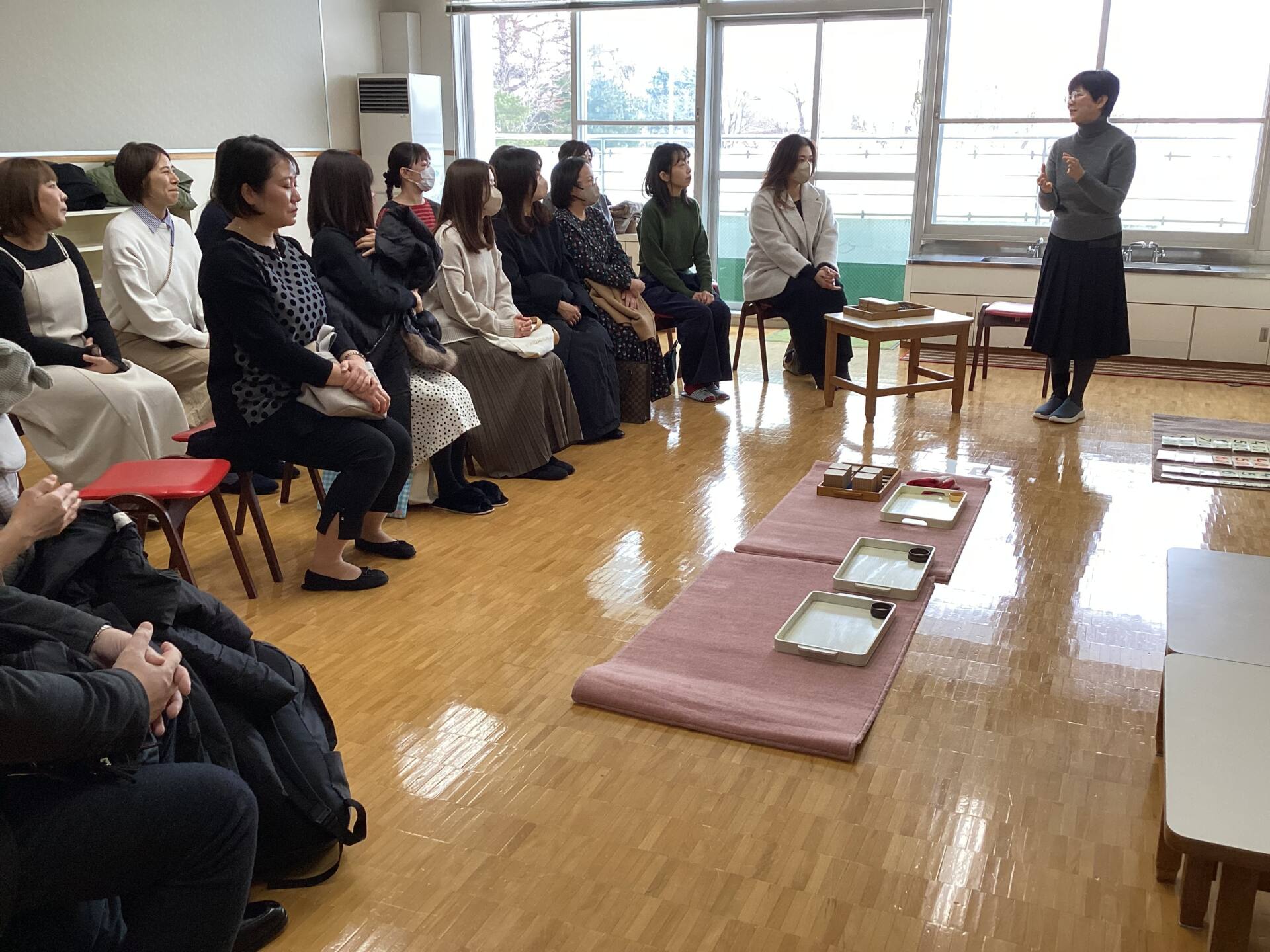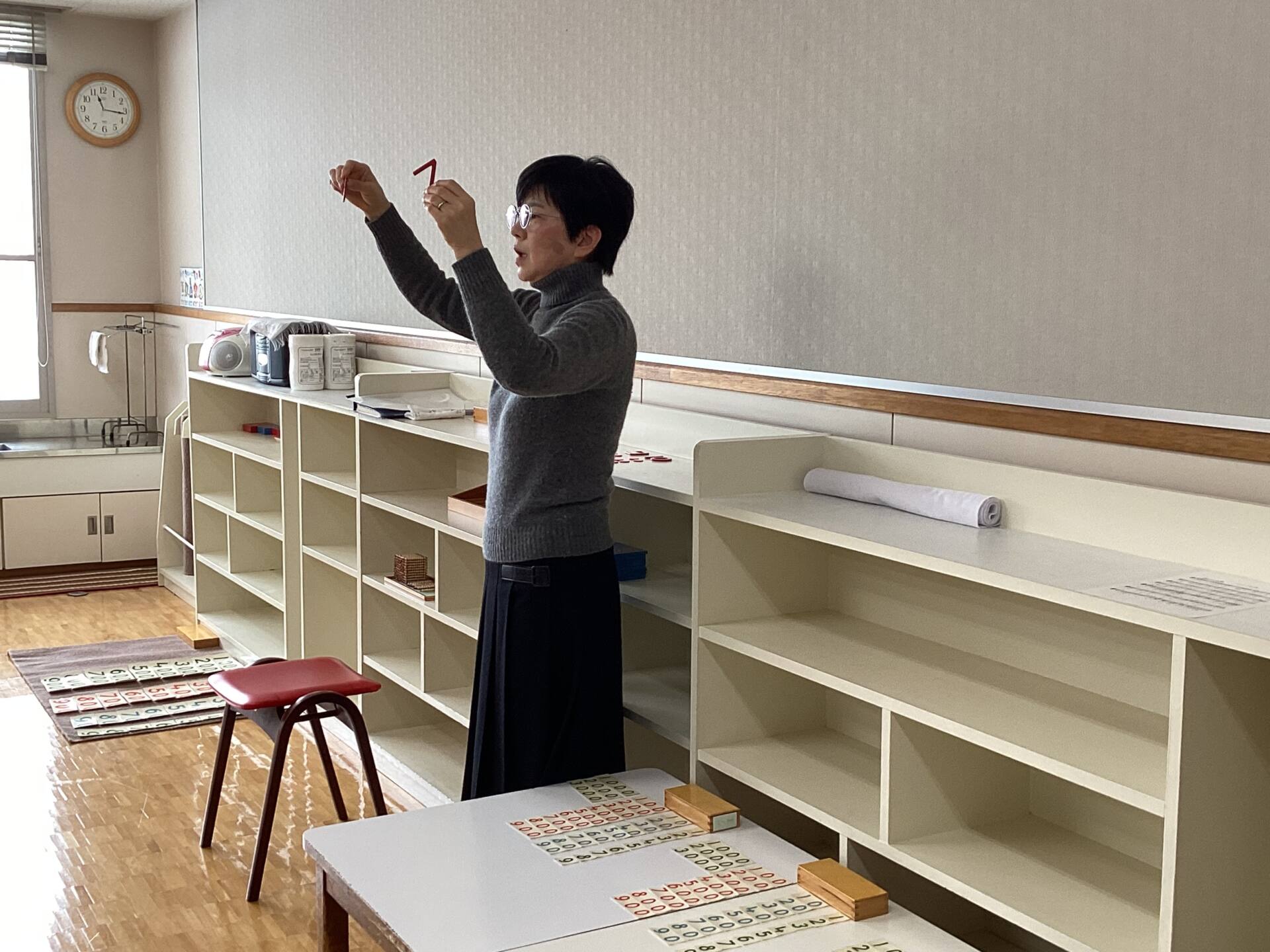 今日の保護者会は、モンテッソーリ教育の数の分野の教具を実際に使って行いました☆ビーズとカードによる加法という提供で、具体物(ビーズ)と抽象物(数字のカード)を一致させる興味深いお仕事でした♪ご参加ありがとうございました😊
